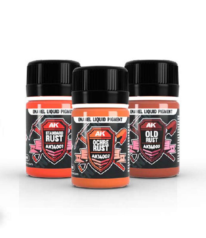 Manufacture Product Number : AKI-14031 This set contains 3 bottles of the newly designed liquid pigment formula, containing common tones to reproduce rust effects. Our liquid pigments can be applied straight from the bottle, directly onto the chosen areas of your model. Once they are dry, they have the same |
