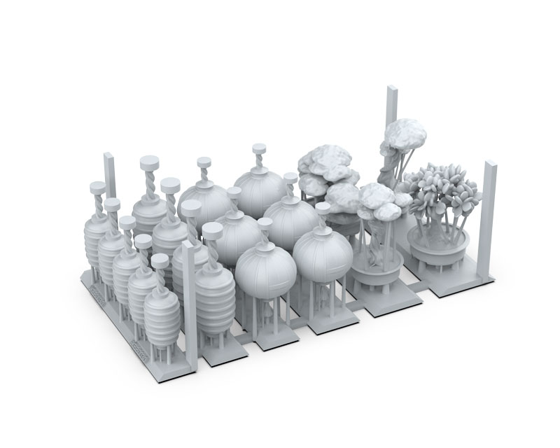 • Themed sets. Each box contains a selection of pieces inspired by a specific environment: plants and rocks, wargame scenarios, special effects…