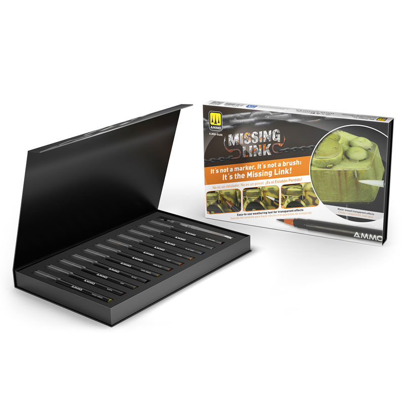 | The new brush tip watercolor marker set from AMMO by MIG Jimenez represents an evolution in modeling tools. Designed for precision, versatility, and ease of use. This set of 12 transparent colors has been carefully selected to reproduce realistic effects on military vehicle models. With Missing Link Brush Tip markers, you can apply everything from filters to weathering effects on your models. Each marker features a high-precision flexible brush tip that delivers smooth, controlled strokes—from fine lines to medium and broader coverage—making it perfect for both detailed work and large surface effects without the need to switch tools. Key features and advantages: Professional Brush Tip - Conical and flexible design allows precise application, ideal for fine detailing and broad weathering effects. Watercolor, Transparent Pigments - Colors are transparent, allowing subtle layering without covering the base coat—perfect for creating filters, shadows, dirt, rust, and smooth color transitions. Easy Blending & Correction - Fully water-soluble formulas allow you to blend effects or remove them entirely with a damp brush or the blending marker included. Semi-Matte, Realistic Finish - Once dry, the colors integrate naturally into the painted surface, simulating techniques like airbrushing—but with greater speed and minimal effort. Vibrant, High-Chromatic Intensity - Shades become more vivid as they dry, enhancing depth and realism. Ergonomic Design - Each marker features an anti-roll cap, clear color identification, and a compact size—ideal for storage and transport. Beginner-Friendly, Pro-Ready - Easy to control and correct, these markers deliver professional results regardless of experience level. Recommended Uses: - Weathering effects for tanks and armored vehicles: dust, mud, rust, streaking, and grime. - Creating realistic shadows and smooth tonal transitions. - Quick, risk-free effects that can be blended, layered, or removed as needed. WARNING: These markers are specifically designed for creating effects over previously painted surfaces. they are not suitable for base coating. - 12 high-quality watercolor markers in realistic tones for military vehicles. - 1 empty blending marker for use with water. - Transparent protective caps for quick color identification. - Anti-roll cap design prevents accidental falling. - Color-coded caps for easy reference. - Compact and portable—ideal for workbenches and travel. - All markers feature flexible, conical brush tips for both precision and broad strokes. - Clean and blend effortlessly with water. |