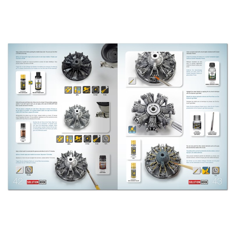 Manufacture Product Number : AMIG-6535 | At the end of 1944, the Luftwaffe changed the RLM regulations for camouflage colors mainly due to a lack of materials, eliminating some of the colors previously used and giving a leading role to new colors which in many cases, were combined with the remaining stock of mid-war colors. This combination of unique colors makes late-war German camouflage the most varied and attractive for modelers. This Premium Solution Book is a 104-page guide that not only explains how to paint and age the camouflage of late-war Luftwaffe fighters to your liking, it also includes a complete step-by-step guide to detailing the model with accessories from various brands and includes panel riveting, cockpit and engine detailing, machine guns, and landing gear upgrades. With this Premium Solution Book, you can create any Luftwaffe fighter with late World War II camouflage, including iconic aircraft such as the Bf 109, Fw 190, Me 410, Bf 110, He 219, and Me 262 among others. Some of the techniques described are optional, and it is up to you to decide whether or not to apply them. If you want to improve your painting and weathering techniques, we recommend that you try to apply them all. This book shows the most suitable products for creating the effects described. If you follow the order of application and drying times, you will be rewarded with excellent results. You can recreate any level of wear and tear on your models by varying the intensity of each effect. The model used in this book is Revell’s 1/32 scale Focke Wulf Fw 190 F8. SOLUTION BOOK is a simple and easy to follow guide which allows any modeler to obtain effects and finishes similar to the examples shown in the book. It doesn't matter if you are a beginner that has just recently started to paint your kits, or a more advanced and experienced modeler. With this guide you can achieve amazing effects with very little effort by following a few simple steps. The new design style of SOLUTION BOOK allows you to follow each step in a simple and intuitive manner without text, by using a simple icon code to guide you through every stage of the process. By following the steps in this guide, you will learn how to obtain exceptional results quickly and easily. |