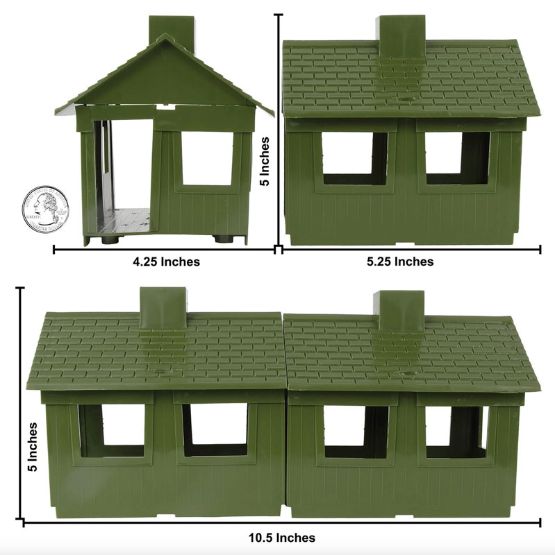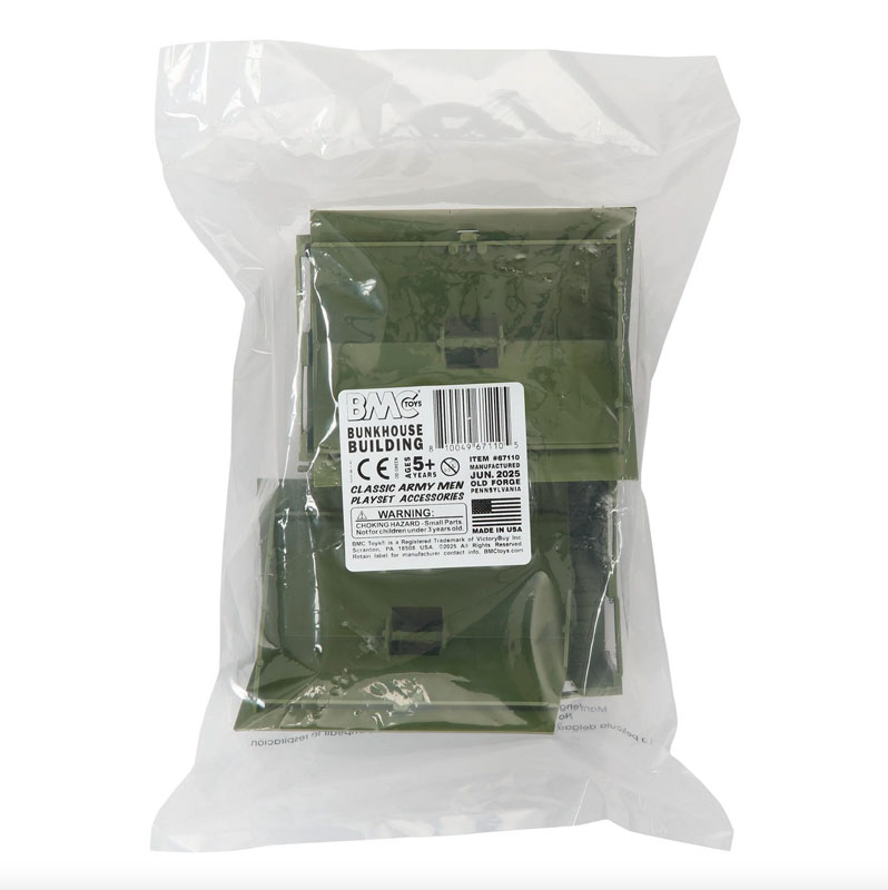 | From the BMC Toys Classic Army Men Collector Series, the MPC Bunkhouse includes 2 cabins that connect together to form a long house. Each building measures 5 inches tall x 4.25 inches wide x 5.25 inches long or 10.5 inches long when connected together. Made from OD-Green color slightly stiff HDPE plastic and approximately 1:32 scale. These houses were first offered around the 1960s by MPC (Multiple Products Corporation). This new production is manufactured using the original plastic injection tools which have been restored and improved by removing the obsolete floor pegs, making chimneys taller, and refining fit of bottom clip. These accessories are a perfect addition for Playsets and school project dioramas of many eras and conflicts from the old west to 20th century. Minor assembly requires clipping on roofs and connecting the 2 cabins to make the Bunkhouse. Packed in clear bag with insert card and recommended for ages 5 and up. - Color: OD-Green - Size: 10.5 inches long x 4.25 inches wide x 5 inches tall - Scale: 1:32 |