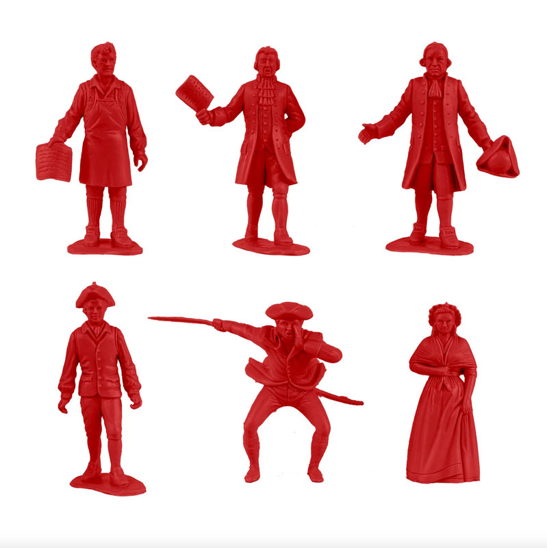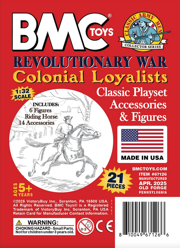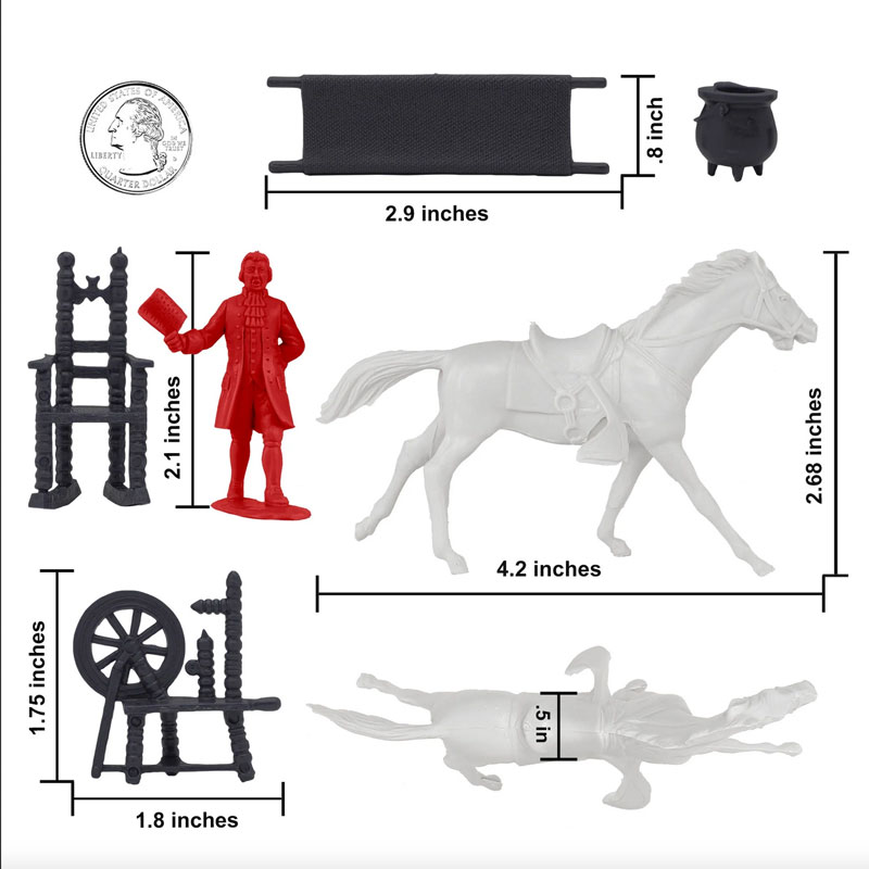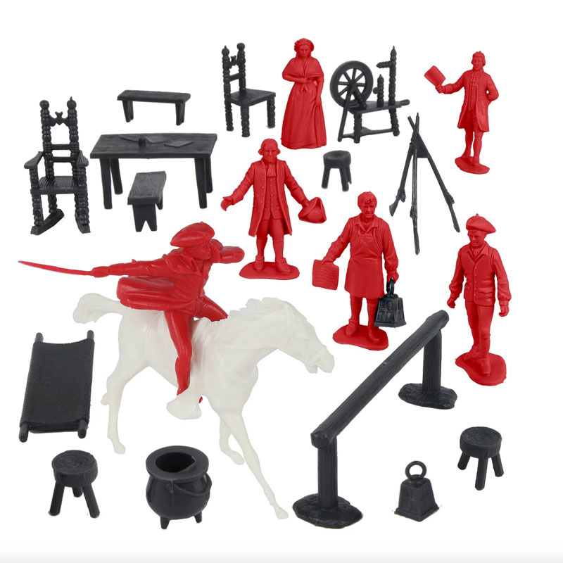 Manufacture Product Number : BMC-67126 | From the Classic Army Men Collector Series, BMC Toys brings the American Revolution to life. This 21 piece Set includes a Rider and horse, 5 Colonial Loyalist Civilians, 2 lanterns, and a variety of furniture and accessories. Figures stand up to 2.2 inches tall and are made from flexible LDPE Red color plastic with very little flashing and lots of detail. The riding horse is made from Polypropylene Soft-White color plastic with just a little flashing. Accessories are made from slightly stiff Coal-Black color HDPE plastic. Pieces include chair. rocker, 3 stools, 2 benches, table, 2 lanterns, spinning wheel, musket stack, cast iron kettle, and horse hitching post. This Set includes what are often referred to as 'Colonial Characters' and 'Revolutionary War Accessory Group' They were first offered in the 1950s by Louis Marx and Co. and were included in a number of their legendary Playsets spanning many years including several Revolutionary War theme Sets. This new production is manufactured using the original plastic injection tools. Perfect for a historical diorama, as a stand alone miniature Set, or a welcome addition to any 1:32 scale American War for Independence Playset. This is a Set of real American Made toys, meant to be set up, knocked over, picked up, and played with for many years to come. An original story about the 'real' history of this famous 'The Midnight Ride of Paul Revere' is included on the back of the package insert. Packed in clear bag with insert card and recommended for ages 5 and up. - Colors: Red, Coal-Black, Soft-White - Size: Figures stand up to 2.2 inches tall - Scale: Approximately 1:32 |