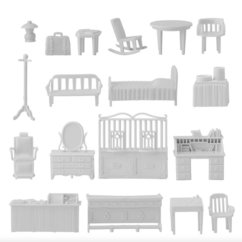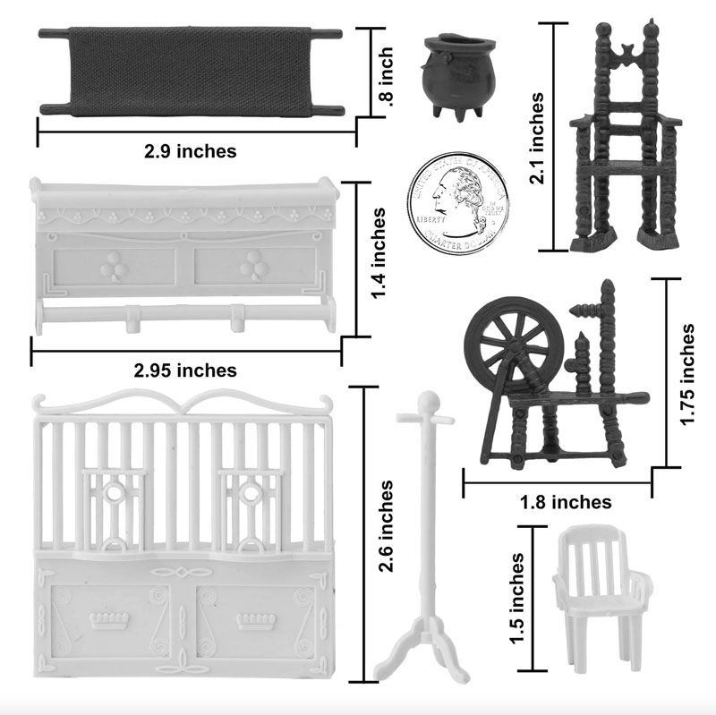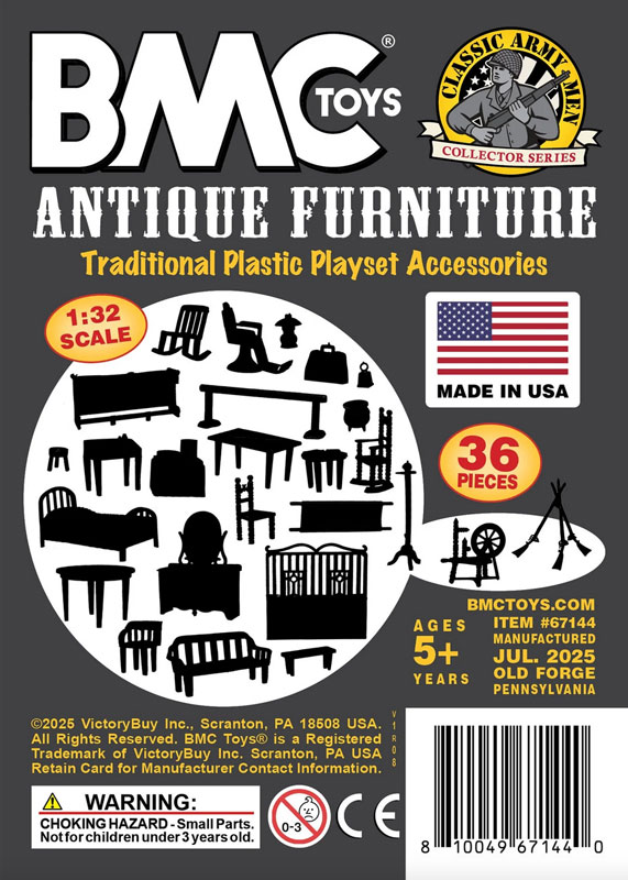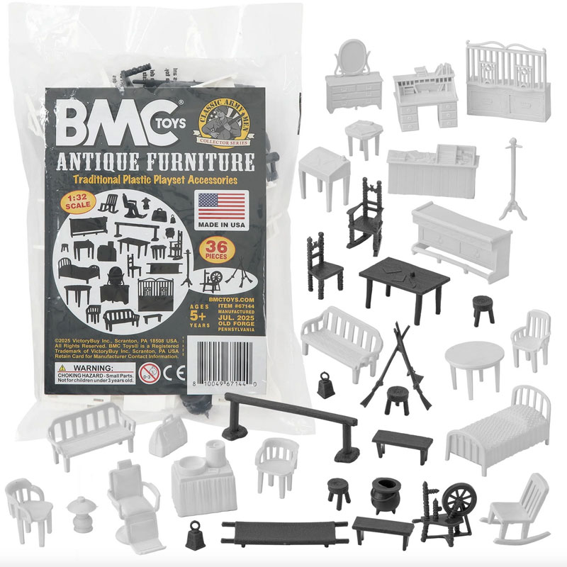 | From the Classic Army Men Collector Series, BMC Toys brings back more classic Playset accessories from yesteryear. This 36 piece Set includes a variety of old-timey furniture and accessories. Pieces are made from slightly stiff Soft-White and Coal-Black color HDPE plastic. Pieces include desks, chairs. benches, bed, bar, dresser, coat rack, barber chair, lanterns, brief case, spinning wheel, musket stack, cast iron kettle, and horse hitching post. This Set includes what are often referred to as the ' Western Hotel Side' and 'Revolutionary War' accessory groups. They were first offered in the 1950s by Louis Marx and Co. and were included in a number of their legendary Playsets spanning many years including Revolutionary War, Western Town, Silver City Western Town, Roy Rogers Mineral City, and Wyatt Earp Dodge City Western Town. This new production is manufactured using the original plastic injection tools. Perfect to furnish Playsets, dioramas and even doll houses and suitable for late 19th century Old West through early and mid-20th century time periods and beyond. This is a Set of real American Made toys, meant to be set up, knocked over, picked up, and played with for many years to come. Packed in clear bag bag with insert card and recommended for ages 5 and up. - Color: Soft-White Western Hotel and Coal-Black Colonial Accessories - Size: up to 2 inches tall - Scale: Approximately 1:32 |