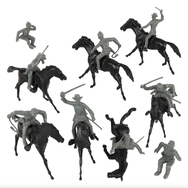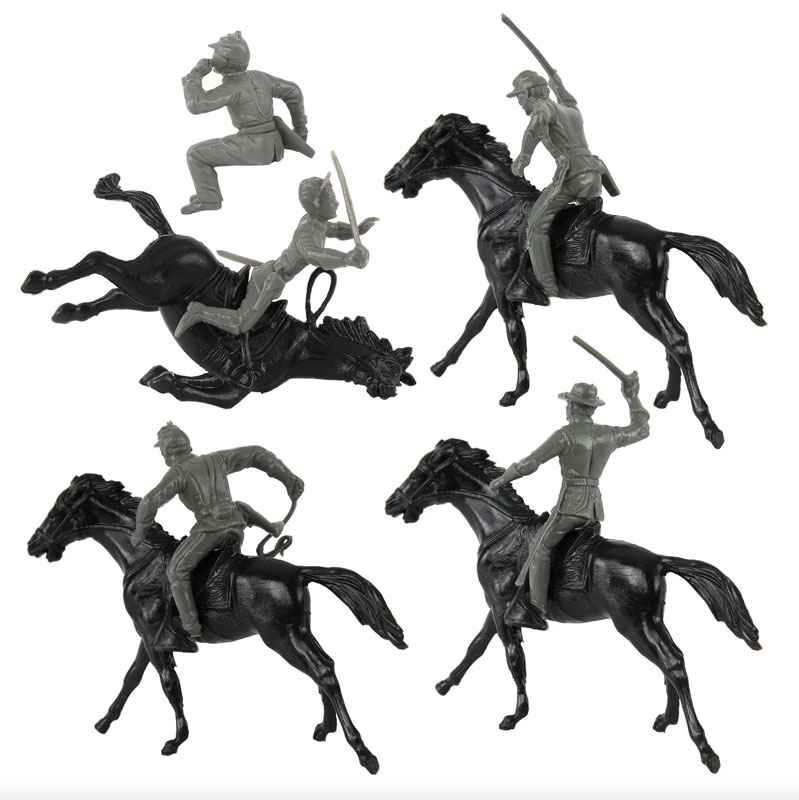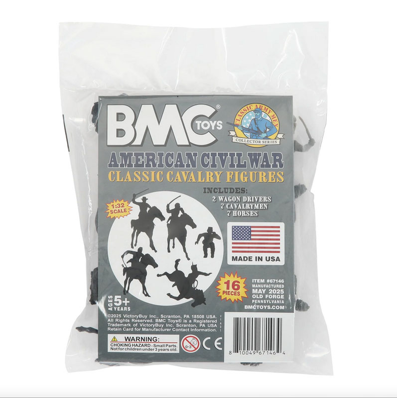 | From the BMC Toys Classic Army Men Collector Series, more favorites from the golden age of Playsets ride again. This 16 piece set of American Civil War Cavalry includes 7 mounted Cavalrymen, 2 seated wagon drivers and 7 horses. Cavalrymen include a falling rider and 2 each sword raised with wide-brim hats, sword raised with kepi hats, kepi hat with whip, and wagon drivers. Horses include one falling and 6 horses that are the same pose standing 2.68 inches tall x 4.2 inches long (including tail) x .5 inch wide (at saddle). Figures are up to 2.1 inches tall and made made from slightly soft LDPE plastic and the horses from slightly stiff Polypropylene plastic. The horses have solid bodies and are not hollow underneath. The riders fit loosely on the horses. These horses were first offered in 1958 by Louis Marx and Co. in the legendary Fort Apache Playset and went on to be included in a number of their legendary Playsets spanning many years including many western and American Civil War theme Sets. This new production is manufactured using the original plastic injection tools. This is a Set of real American Made toys, meant to be set up, knocked over, picked up, and played with for many years to come. Packed in clear bag bag with insert card and recommended for ages 5 and up. - Colors: Charcoal-Gray Figures & Black Horses - Size: Figures up to 2.1 inches tall, Horses are 4.2 inches long - Scale: Approximately 1:32 |