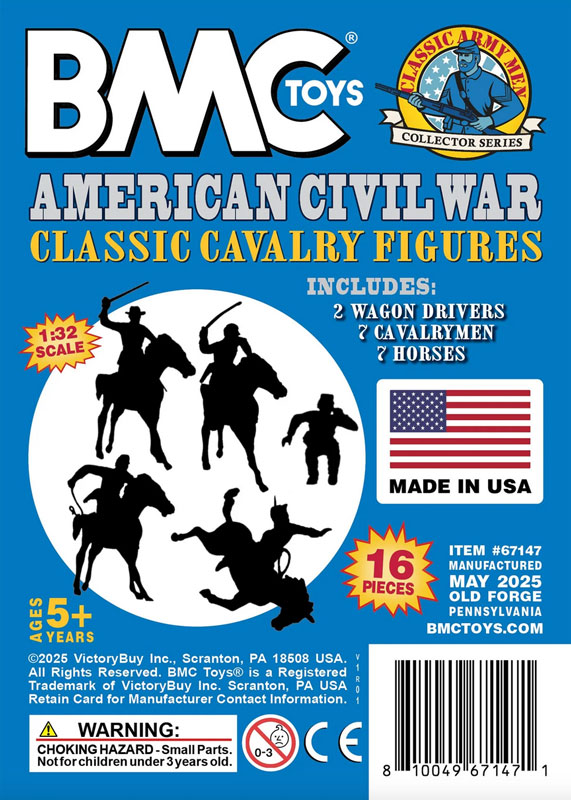 | From the BMC Toys Classic Army Men Collector Series, more favorites from the golden age of Playsets ride again. This 16 piece set of American Civil War Cavalry includes 7 mounted Cavalrymen, 2 seated wagon drivers and 7 horses. Cavalrymen include a falling rider and 2 each sword raised with wide-brim hats, sword raised with kepi hats, kepi hat with whip, and wagon drivers. Horses include one falling and 6 horses that are the same pose standing 2.68 inches tall x 4.2 inches long (including tail) x .5 inch wide (at saddle). Figures are up to 2.1 inches tall and made made from slightly soft LDPE plastic and the horses from slightly stiff Polypropylene plastic. The horses have solid bodies and are not hollow underneath. The riders fit loosely on the horses. These horses were first offered in 1958 by Louis Marx and Co. in the legendary Fort Apache Playset and went on to be included in a number of their legendary Playsets spanning many years including many western and American Civil War theme Sets. This new production is manufactured using the original plastic injection tools. This is a Set of real American Made toys, meant to be set up, knocked over, picked up, and played with for many years to come. Packed in clear bag bag with insert card and recommended for ages 5 and up. - Colors: Blue Figures & Soft-White Horses - Size: Figures up to 2.1 inches tall, Horses are 4.2 inches long - Scale: Approximately 1:32 |