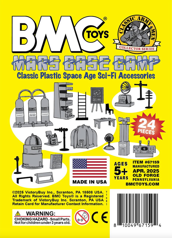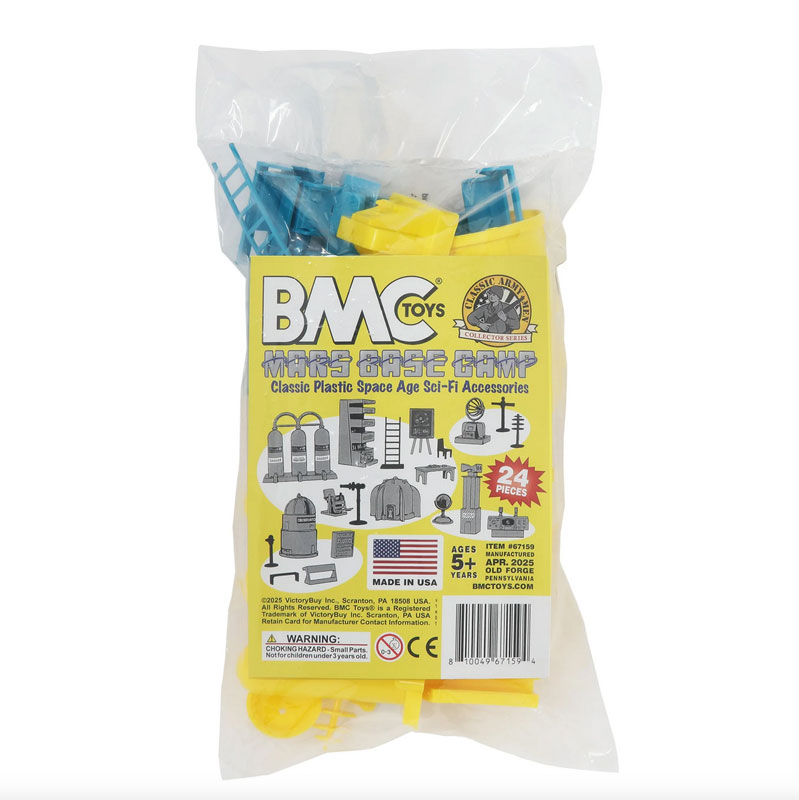 | From the Classic Army Men Collector Series, BMC Toys brings back more classic toys from yesteryear. This 24 piece Set of includes a variety of space themed accessories and furniture. The following pieces are made from slightly stiff Yellow color HDPE plastic: Gravity Chamber, Observatory Dome with skylight, 3 chamber Fuel Tank, Radar Antenna, Supply Cabinet, Speaker Tower, Laser on Stand, Searchlight on base, Camera on stand, Telescope on stand, and Disc Antenna. These pieces are made from slightly stiff Teal-Blue color HDPE plastic: Teacher Desk, Chair, Easel, Ladder, 2 Student Desks, 4 Student Benches, Control Chair, and Control Console. These accessories were first offered in the 1950s by Louis Marx and Co. and were included in a number of their legendary Playsets spanning many years including Tom Corbett Space Academy, Space Patrol, Rex Mars, Captain Space, Cape Canaveral, Operation Moonbase, Martian Landing and even the 1979 Galaxy Command Playset during the Star Wars craze. This new production is manufactured using the original plastic injection tools. This is a Set of real American Made plastic toys, meant to be set up, knocked over, picked up, and played with for many years to come. Packed in clear bag bag with insert card and recommended for ages 5 and up. - Colors: Yellow Cape Canaveral & Teal-Blue Space Academy Accessories - Scale: Up to 1:32 - Size: up to 4 inches tall |