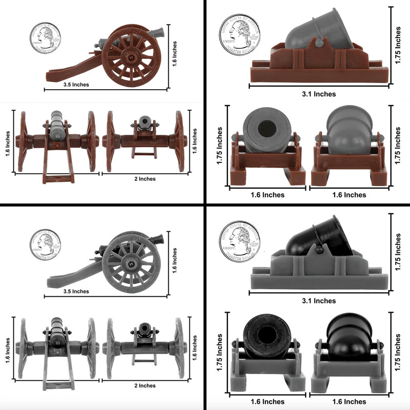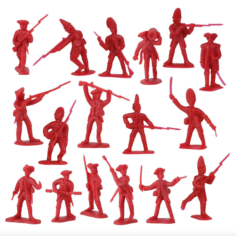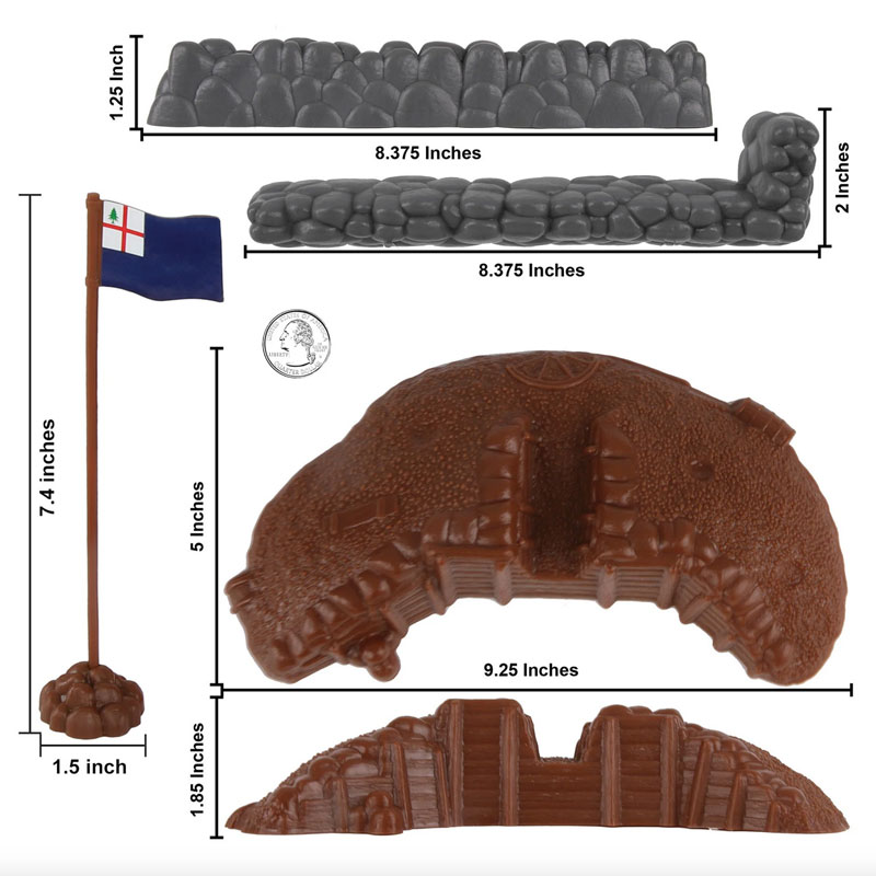 | From the BMC Toys American Hero Collector Series, an early defeat for the Americans and costly victory for the British. The American Revolutionary War Battle of Bunker Hill 115 piece Plastic Army Men Playset features 22 different figures and includes 33 blue Colonial Americans and 33 British Empire Redcoats. Also includes character figure of General George Washington astride his horse 'Blueskin'. Set includes 4 cannon with rolling wheels, 4 mortar, and lots of terrain and camp accessories. Supplies include a large crate, small crate, supply stack, camp supplies terrain piece, camp fire, wooden wheel cart, and 2 farm horses. Terrain pieces include 3 redoubt positions, 4 stone walls, 3 leafy green trees, 6 rustic fences, 12 spike barricades, 2 brown rocks, and 2 flags. All pieces are approximately 1:32 scale. Figures stand up to 2.3 inches tall and are made from soft flexible plastic with medium detail and very little flashing. Accessories are made from slightly to very stiff plastic. BMC Toys was founded by Bill McMaster in 1991 and specializes in producing historically accurate Plastic Army Men figures and Playsets in the classic realistic classic realistic miniature style of the 1950s and 1960s. Instructions: With adult supervision, dip any bent part in hot water, then cold water to straighten. These miniature figures are a perfect addition to any American War for Independence Playset or school project diorama. Packaged in a full color box featuring a history of the battle story. Recommended for ages 5 and up - 33 Americans, 33 British, 8 Artillery, 3 Redoubts, 12 Barricades, Wagon - 10 Walls & Fences, 3 Trees, 5 Accessories, 3 Horses, 2 Rocks, 2 Flags - Scale: Approximately 1:32 |