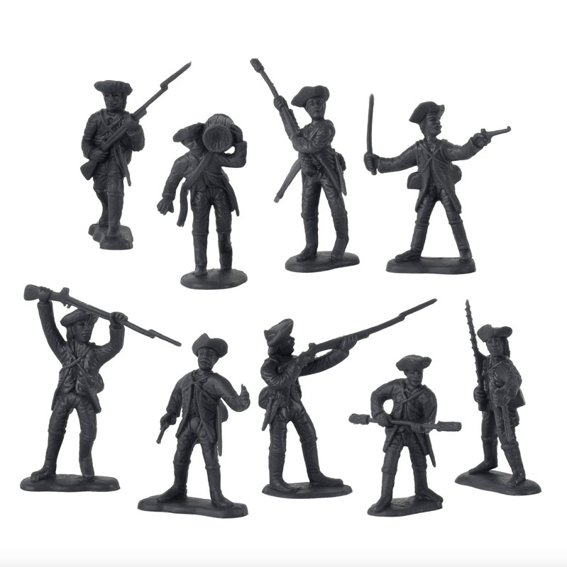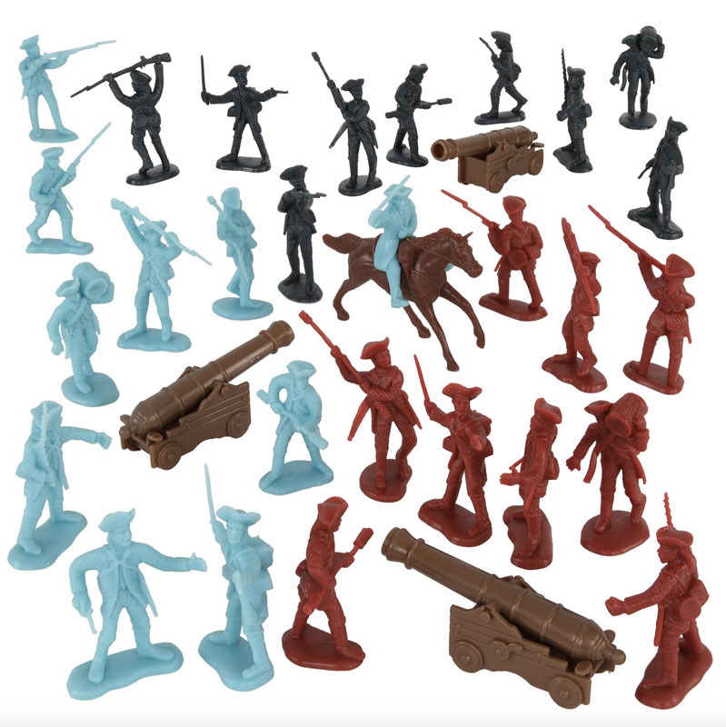 Manufacture Product Number : BMC-67214 | From the BMC Toys American Hero Collector Series, a temporary retreat in New York that led to victory in New Jersey. The American Revolutionary War Battle of White Plains Artillery Attack 32 piece Plastic Army Men Set features 10 different figures and includes 9 Colonial Americans in Powder-Blue, 9 British Empire Redcoats in Deep-Red, and 9 Hessian Soldiers in Coal-Black. Also includes character figure of General George Washington astride his horse 'Old Nelson', and 3 Bronze color Naval 12 Pounder Cannon. The figures are made from fairly flexible LDPE plastic with medium detail, stand up to 2.3 inches tall and are 1:32nd scale. Cannon measure 1 inch x 1 inch x 3 inches long and are made from stiff black color ABS plastic. BMC Toys was founded by Bill McMaster in 1991 and specializes in producing historically accurate Plastic Army Men figures and Playsets in the classic realsitic style of the 1950s and 1960s. Packaged in clear bag with header card and recommended for ages 5 and up. - Colors: Deep-Red British, Coal-Black Hessians, and Powder-Blue Americans - Size: Figures stand up to 2.3 inches tall - Scale: Approximately 1:32 |