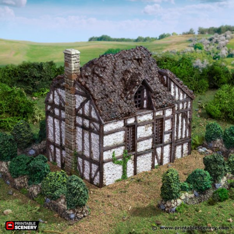Manufacture Product Number : DUN-1094 | The Wattle and Daub Barlyway Cottage is great addition for your tabletop fantasy role-playing and historical wargames. The piece measures approximately 5.96" x 4.13" x 5.42" All items are printed in non-toxic PLA filament at a high 0.15mm resolution (and an ultra high 0.1mm resolution for small pieces). As with all 3D prints, some finishing may be required. Supplied unpainted and unassembled. Miniatures are for scale and not included. This item is part of Printable Scenery's King and Country campaign. Items manufactured by Dungeon Artifacts, licensed printer of Printable Scenery Ltd 3D models are copyright to Printable Scenery Ltd |