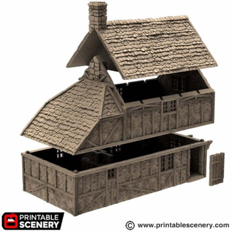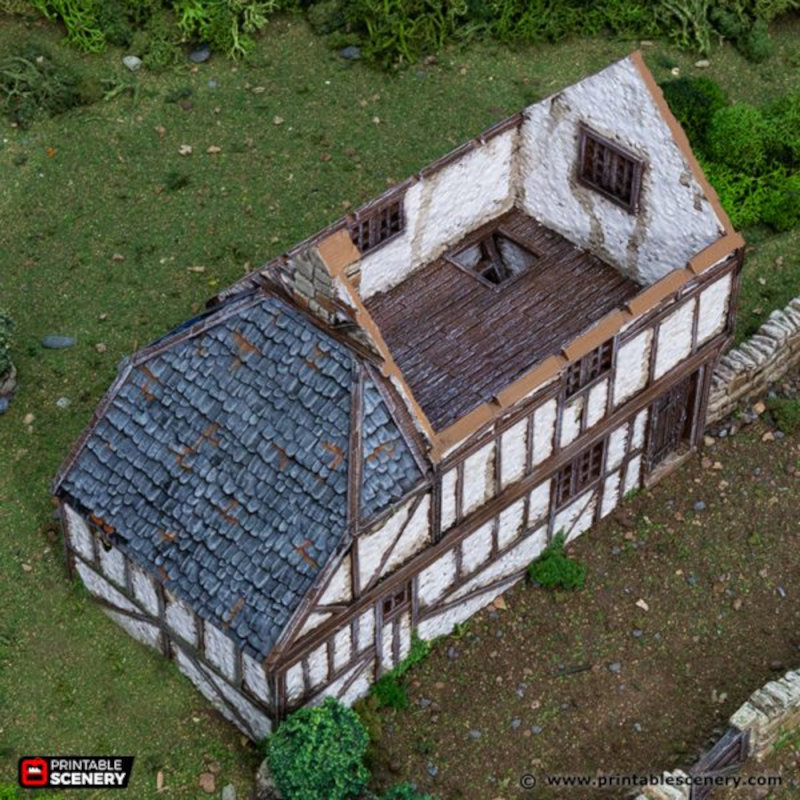 Manufacture Product Number : DUN-1095 | The Wattle and Daub Hollyhock Cottage is great addition for your tabletop fantasy role-playing and historical wargames. The piece measures approximately 7.85" x 4.21" x 6.2" All items are printed in non-toxic PLA filament at a high 0.15mm resolution (and an ultra high 0.1mm resolution for small pieces). As with all 3D prints, some finishing may be required. Supplied unpainted and unassembled. Miniatures are for scale and not included. This item is part of Printable Scenery's King and Country campaign. Items manufactured by Dungeon Artifacts, licensed printer of Printable Scenery Ltd 3D models are copyright to Printable Scenery Ltd |