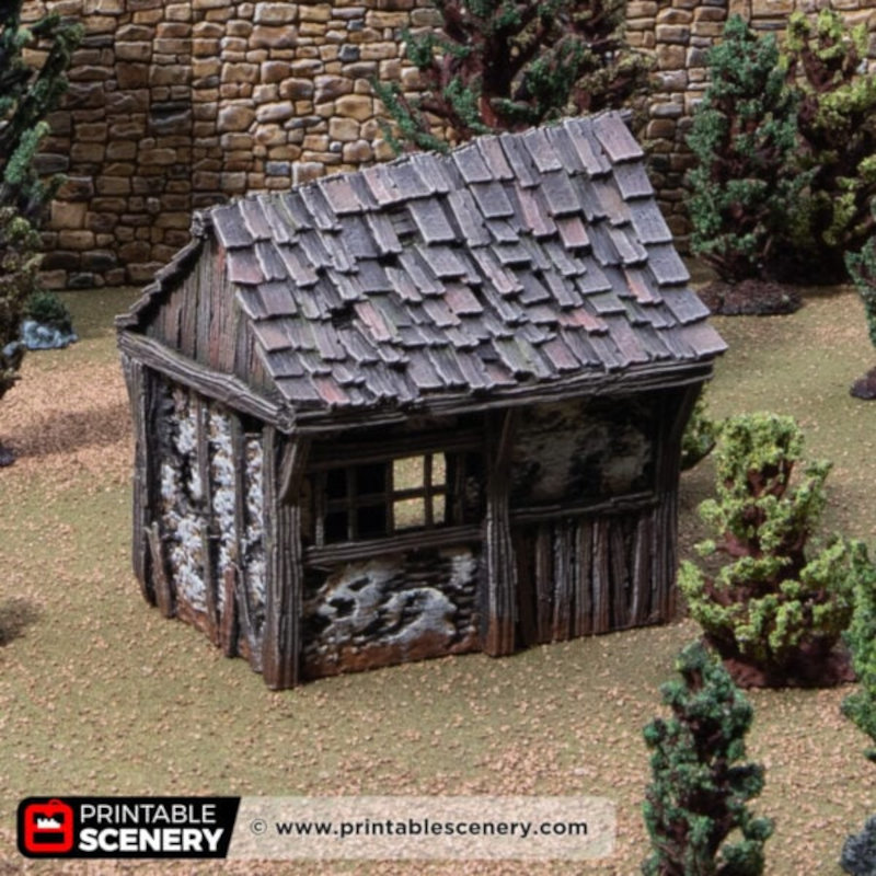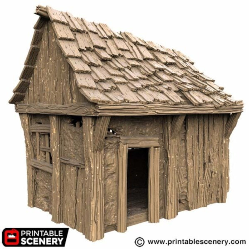 Manufacture Product Number : DUN-1117                          | Osberts Shanty is a great piece for your tabletop fantasy role-playing and historical wargames. The piece measures approximately 3.55" x 3.05" x 3.46" This set comes unpainted in 2+ pieces. All items are printed in non-toxic PLA filament. For standard the item is printed at a high 0.15mm resolution. Color may vary. 3D models are copyright to Printable Scenery Ltd |