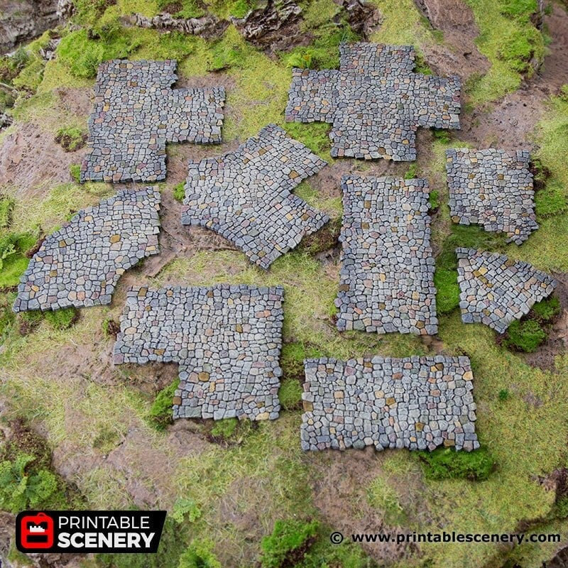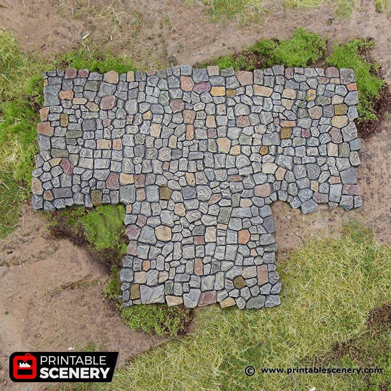 | Pathways is a detailed set of scatter terrain for your fantasy tabletop role-playing and wargames. A versatile, modular road set, it works great whether it's a town or a country scene, with a detailed design that would compliment any building or figurine. Available in 4 different sets, allowing you to customize a path that's as winging, branching, or straight-forward as you like: Straight Stretch, Bends, Right-Angle Turns, and Junctions. There is also a full set option which has one of each of the subsets. There are also 2 types of pathway, Street and Road. Street is meant as a small pathway on a side street while Road is a wider main street. Both synergize with the Hagglethorn Bridge which slots into the grooves on the street. The longest straight pathway in the street size measures 4.12" x 2.01" x 0.15" Item comes unpainted in 6+ pieces. All items are printed in non-toxic PLA filament. For standard the item is printed at a high 0.15mm resolution. Color may vary. As with all 3D prints, some finishing may be required. 3D models are copyright to Printable Scenery Ltd |
