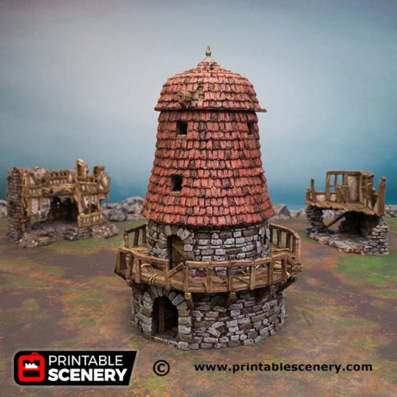 | The Haunted Windmill is a great piece of terrain for your fantasy tabletop role-playing and wargames. It measures approximately 6.7" x 6.7" x 9.7" Item comes unpainted in 16+ pieces. All items are printed in non-toxic PLA filament. Item is printed at a high 0.15mm resolution, and with an ultra high 0.1mm resolution used for small pieces. As with all 3D prints, some finishing may be required. 3D models are copyright to Printable Scenery Ltd |