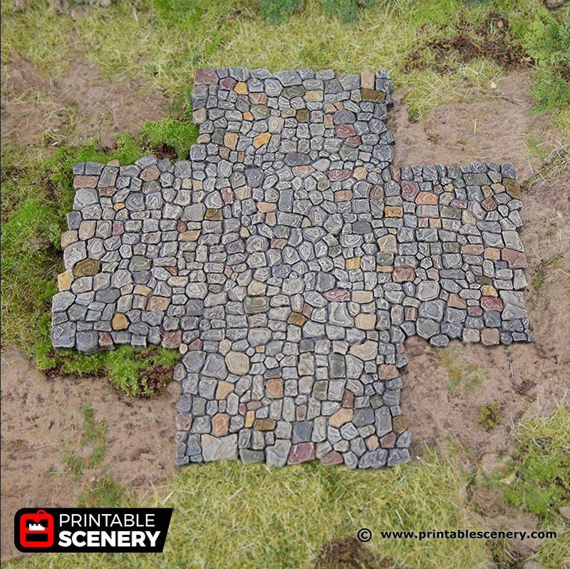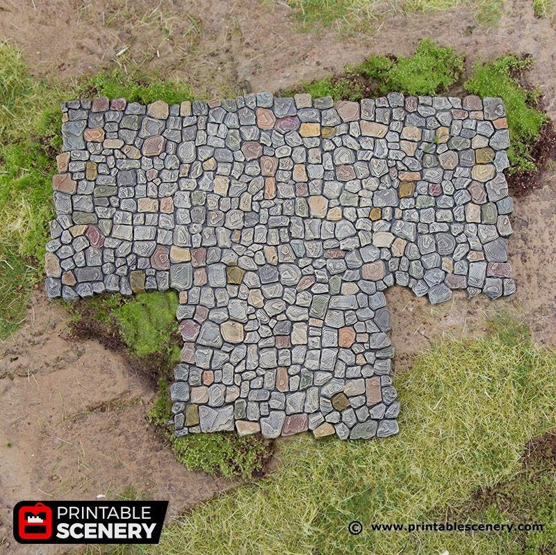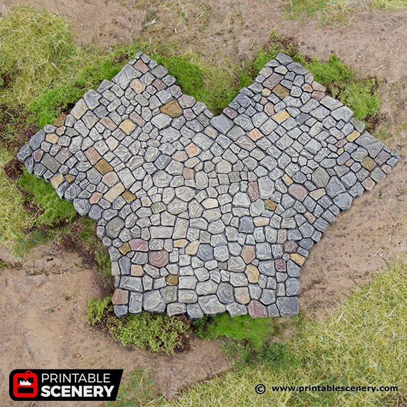| Pathways is a detailed set of scatter terrain for your fantasy tabletop role-playing and wargames. A versatile, modular road set, it works great whether it's a town or a country scene, with a detailed design that would compliment any building or figurine. Available in 4 different sets, allowing you to customize a path that's as winging, branching, or straight-forward as you like: Straight Stretch, Bends, Right-Angle Turns, and Junctions. There is also a full set option which has one of each of the subsets. There are also 2 types of pathway, Street and Road. Street is meant as a small pathway on a side street while Road is a wider main street. Both synergize with the Hagglethorn Bridge which slots into the grooves on the street. The longest straight pathway in the street size measures 4.12" x 2.01" x 0.15" Item comes unpainted in 7 pieces. All items are printed in non-toxic PLA filament. For standard the item is printed at a high 0.15mm resolution. Color may vary. As with all 3D prints, some finishing may be required. 3D models are copyright to Printable Scenery Ltd |