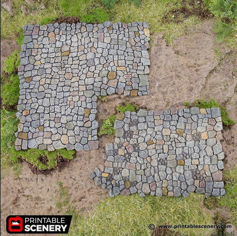 | Pathways is a detailed set of scatter terrain for your fantasy tabletop role-playing and wargames. A versatile, modular road set, it works great whether it's a town or a country scene, with a detailed design that would compliment any building or figurine. Available in 4 different sets, allowing you to customize a path that's as winging, branching, or straight-forward as you like: Straight Stretch, Bends, Right-Angle Turns, and Junctions. There is also a full set option which has one of each of the subsets. There are also 2 types of pathway, Street and Road. Street is meant as a small pathway on a side street while Road is a wider main street. Both synergize with the Hagglethorn Bridge which slots into the grooves on the street. The longest straight pathway in the street size measures 4.12" x 2.01" x 0.15" Item comes unpainted in 4 pieces. All items are printed in non-toxic PLA filament. For standard the item is printed at a high 0.15mm resolution. Color may vary. As with all 3D prints, some finishing may be required. 3D models are copyright to Printable Scenery Ltd |