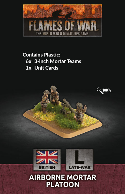 Manufacture Product Number : FLW-BR815 | With six tubes at their disposal, the airborne mortar platoon is quite effective. Landing by glider, the platoon is quickly ready for action, providing the company with its own integral, highly mobile and accurate light artillery asset. Mortar bombs fly in a high-arcing trajectory, soaring over friendly troops and intervening terrain, to drop down onto the target from above. Unlike most other infantry weapons, they cannot conduct direct fire. |