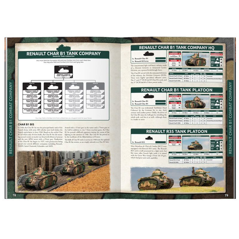 Manufacture Product Number : FLW-FW281 | Inside You Will Find: - History and Background of the Invasion of France in 1940 - German Force, Formations and Units for: Light Tank Company, Medium Tank Company and more... - French Force, Formations and Units for: Somua S35 Combat Squadron, Char B1 Tank Company, Chasseurs Company and more... - British Force, Formations, and Units for: A13 Armoured Squadron, Matilda I Tank Company, Matilda II Tank Company, Rifle Company and more... - Missions and Rules - Inspirational Colour Photos - Painting and Basing Guides - Free Forces Of War Code unlock all of the lists included Blitzkrieg on our army builder website - Free Flames Of War DIgital Code to download a copy of the book to your digital device - Free Catalogue detailing the miniatures and accessories featured in the book |