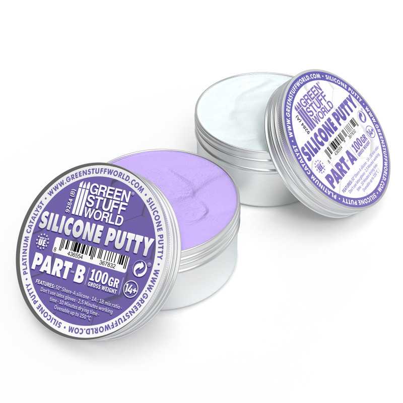 | Green Stuff World Silicone Putty is platinum silicone that can be easily mixed and applied by hand. Mix it in equal amounts (1A:1B) by volume. Green Stuff World Silicone Putty has a pot life of 2.5 minutes with a cure time of 10 minutes. Shrinkage is very low (0.03%) and when cured is exceptionally strong and durable (tear strength 6 N/mm). It will resist temperatures up to 150ºC. Other applications include making fast mold impressions from almost any surface, orthotics, jewelry making and more. The cure of the silicone putty may be inhibited by certain contaminants in or on the pattern to be molded resulting in tackiness at the pattern or a total lack of cure throughout the mold. Wear vinyl gloves only, since Latex gloves will inhibit the cure of the rubber. Also, tin-cure silicone, sulfur clays, certain wood surfaces, newly cast polyester resin, epoxy or urethane rubber may cause inhibition. If compatibility between the silicone rubber and the surface is a concern, a small-scale test is recommended. Apply a small amount onto a non-critical area of the pattern. Inhibition has occurred if the rubber is gummy or uncured after the cure time has passed. This set contains 200gr. of Green Stuff World Silicone Putty (100gr PartA + 100gr PartB) - 50º Shore-A hardness - Color: Violet - 1A:1B mix ratio, mixed by hand - 2.5 minutes pot life - 10 minutes cure time - Ovenable up to 150ºC - Non edible |
