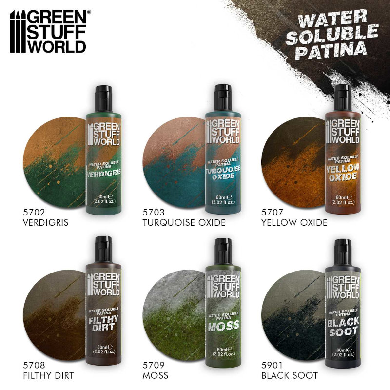 Water-Soluble Patina is a partially water-soluble decorative patina designed to create realistic effects of aging, grime, rust, moisture, soot, wear, and tonal variations on miniatures, models, scenery, props, and other non-porous surfaces. Its formula provides an ultra-matte, natural finish and is designed so that the pigments settle organically into crevices, textures, and reliefs, achieving more believable results than those of conventional paint. Additionally, it is a non-toxic acrylic product with no harsh fumes. It is important to shake the product well before each use, as some components may separate and settle at the bottom of the container during storage. If it has been left to stand for a long time, you can use metal balls to mix it thoroughly. Using a wet palette is not recommended. It can be applied directly or diluted slightly with water if necessary. Clean brushes and tools with water or alcohol immediately after use and prevent the product from drying on them. It can also be used with an airbrush to achieve smoother transitions, weathering effects, and large-scale aging effects. Depending on the pressure used in the compressor, it may be necessary to slightly dilute the product for use in the airbrush. In that case, add a few drops of water and stir until well diluted. Clean the airbrush as usual after use. Apply to clean, dry, grease-free surfaces such as plastic, resin, or metal. Not recommended for porous or absorbent surfaces such as untreated wood or paper. The intensity of the effect will depend on the amount applied, the number of coats, and the technique used. To remove and activate the product, use cotton swabs, a brush, or a sponge dampened with water to remove excess and activate the product, thereby achieving finishes ranging from soft and subtle to more intense, irregular, and personalized effects. Since it is partially water-soluble, the finish may be altered if it gets wet or is handled with wet hands; therefore, it is recommended to seal the final result with a matte varnish to preserve it and maintain its natural appearance. |