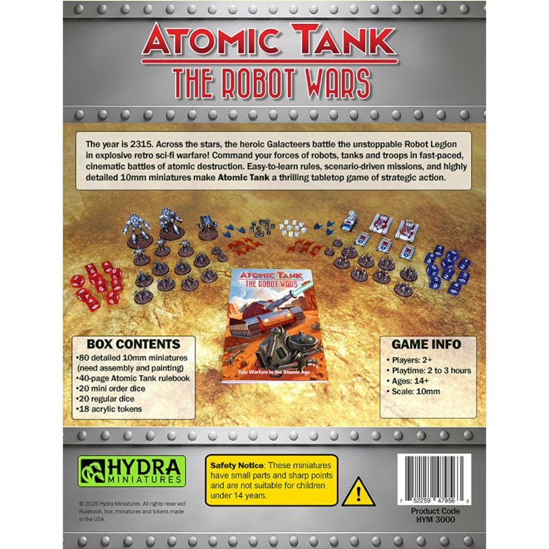 Manufacture Product Number : HYM-3000 The year is 2315. Across the stars, the mighty Galacteers battle the unstoppable Robot Legion in explosive retro sci-fi warfare! Command your forces of robots, tanks, walkers, and rocket troops in fast-paced, cinematic battles of atomic destruction. Easy-to-learn rules, scenario-driven missions, and highly detailed 10mm miniatures make Atomic Tank a thrilling tabletop game of strategy and spectacle. Build your army. Choose your orders. Prepare for battle, Commander! |