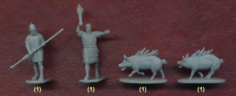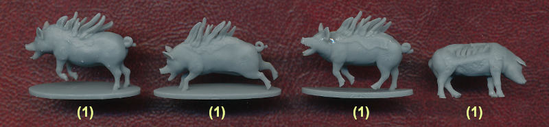| 2 figures in 2 different poses and 6 swine in 6 different poses |