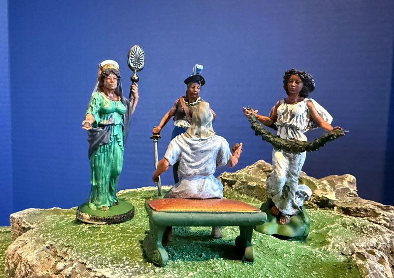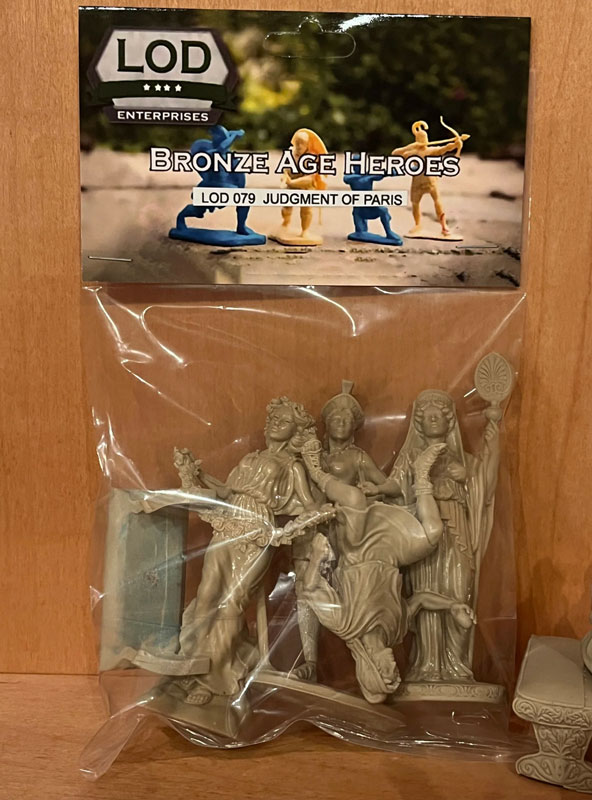 This figure set includes Hera, Aphrodite, Athena (new pose), Paris, and a bench. The picture illustrates how the model should look once completed. Glue and paint are not included in the kit. |