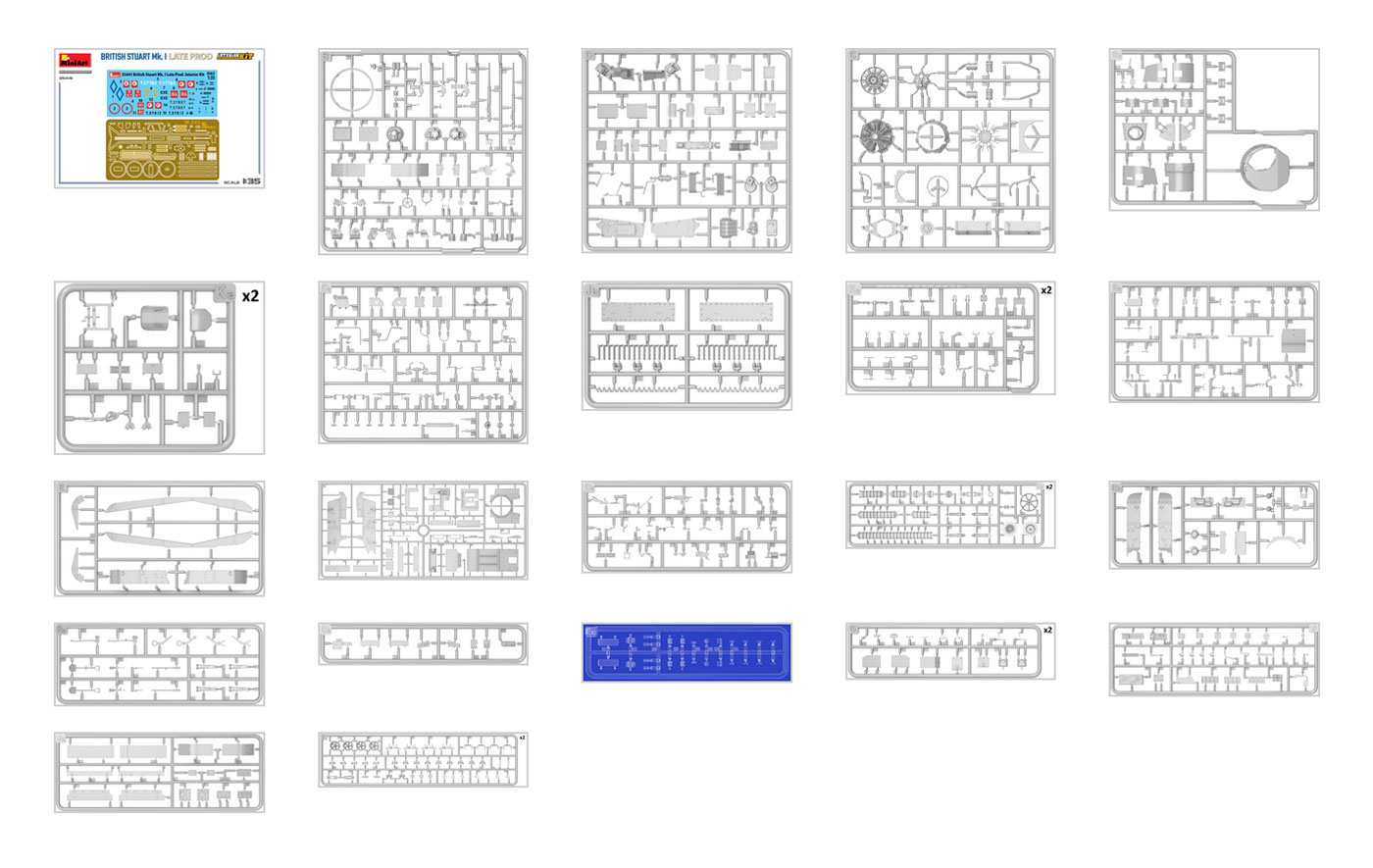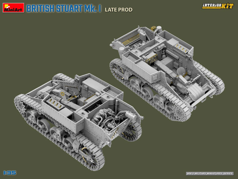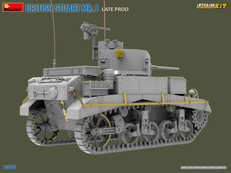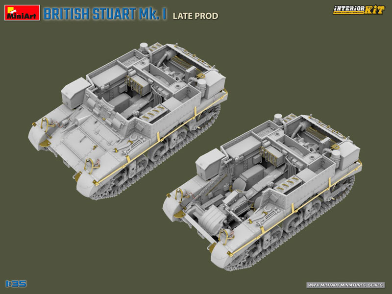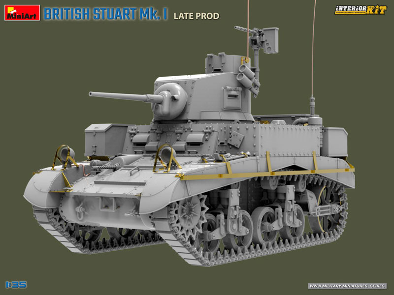 | The British Stuart Mk. I Late Production was an early variant of the American M3 light tank, supplied to the UK through Lend-Lease. Fast and reliable, it saw action in North Africa, Europe, and the Far East, serving mainly in reconnaissance and support roles. This 1:35 scale kit features a fully detailed interior, including driver’s and fighting compartments, engine, and transmission. PE parts and 3 marking options are included. - Accurate representation of the British Stuart Mk. I Late Production - Full interior kit: driver’s compartment, fighting compartment, engine, and transmission - Includes finely detailed photo-etched parts - 3 decal options with historical markings All models are supplied as kits and will need to be assembled and painted. The picture illustrates how the model should look once completed. Glue and paint are not included in the kit. |