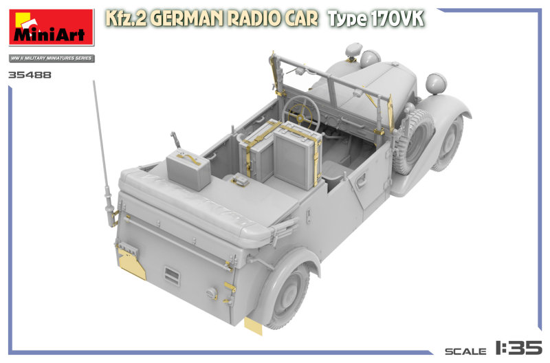 Manufacture Product Number : MAT-35488 This kit represents the Kfz.2 German radio car based on the 170VK chassis, widely used for command and communications roles in the early stages of World War II. Equipped with onboard radio equipment, this vehicle played a key role in maintaining battlefield coordination. The model is well suited for early-war dioramas, command scenes, and support vehicle displays.