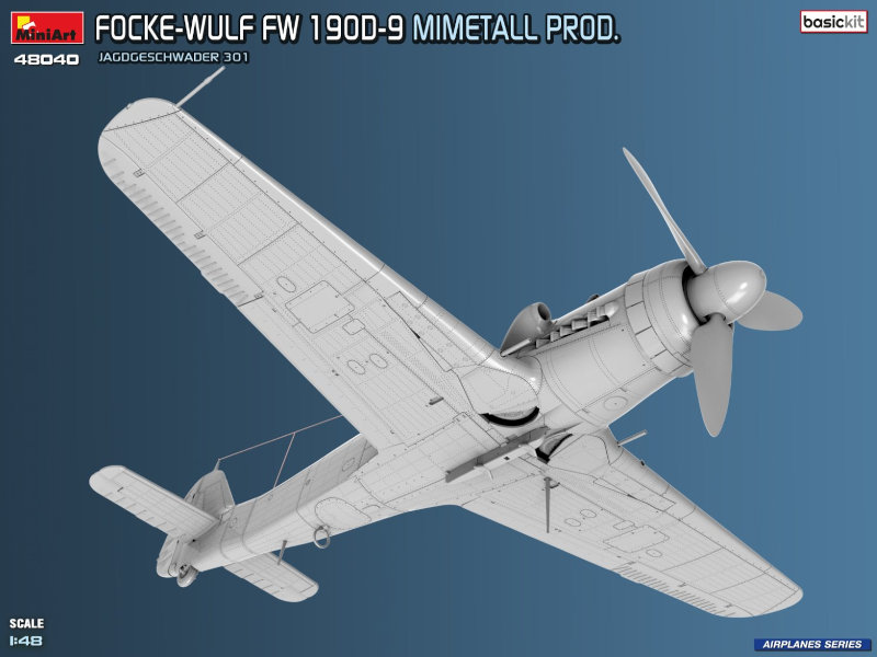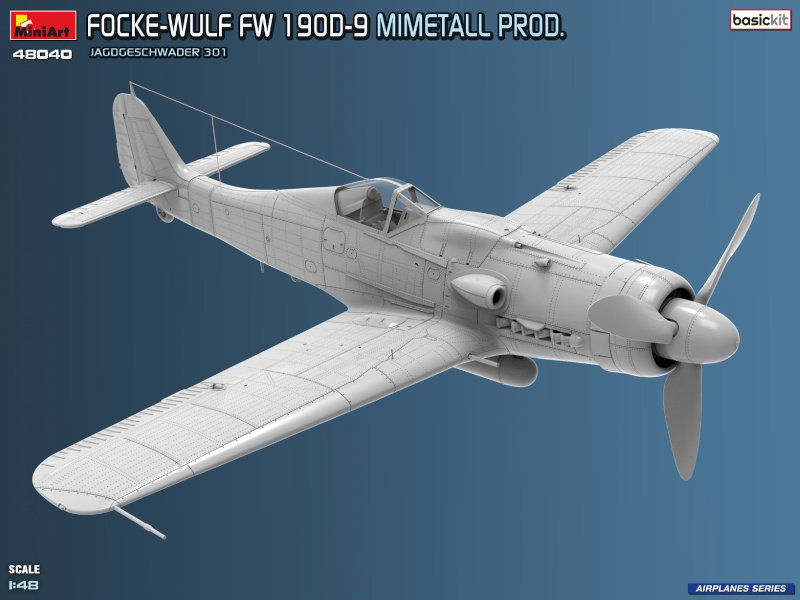 Manufacture Product Number : MAT-48040 The Focke-Wulf FW 190D-9, was developed as a high-performance fighter to improve high-altitude capability. Aircraft produced by Mimetall were delivered in late-war conditions and often featured simplified finishes. Machines of Jagdgeschwader 301 were among those flown during the final phase of WWII.