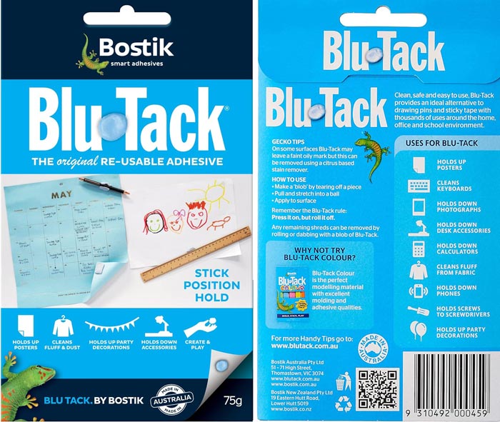 Manufacture Product Number : MNN-1001 Blu-Tack is a reusable pressure-sensitive adhesive putty originally made for household use — like sticking posters or papers to walls without nails, tape, or pins. Over time, it’s also become a popular tool in hobbies, crafts, and scale modeling because it’s flexible, clean, and easy to remove. Basic Facts |