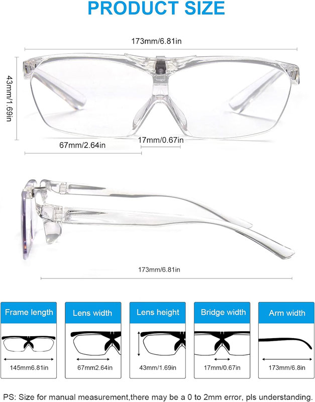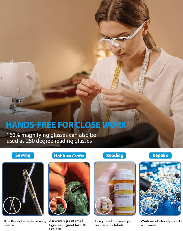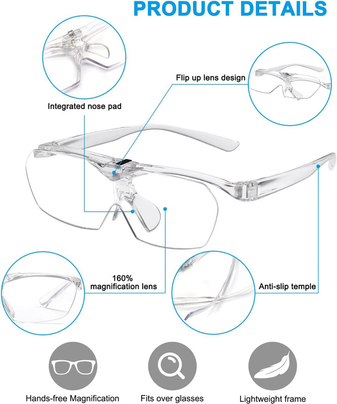 | - Hands-Free Close-Up Work Unlike bulky handheld magnifiers, these glasses keep your hands completely free for embroidery, diamond painting, model making, soldering, sewing, crafts, knitting, cross stitch, jewelry work, watch repair, and more. - Flip-Up Lens Design Lenses flip down for detailed close-up tasks and flip up for distance viewing—quick and convenient without taking the glasses off. - Clear Magnification Provides 60% magnification for finer, clearer details. The 160% model also works as +2.50 diopter reading glasses. -Lightweight & Comfortable Fit Won't pressure your ears. Features scratch-resistant lenses, non-slip temples, and can be worn over prescription glasses for all-day comfort. - What You Get Includes 1× 160% flip-up magnifier, cleaning cloth, soft storage bag, and gift box. |