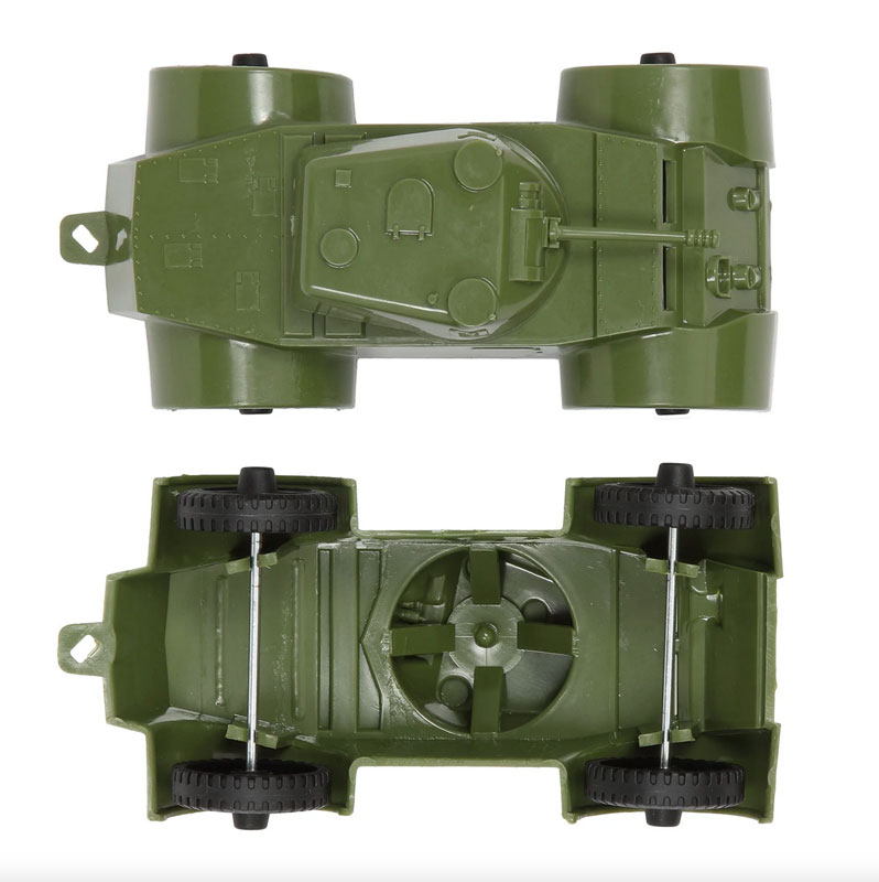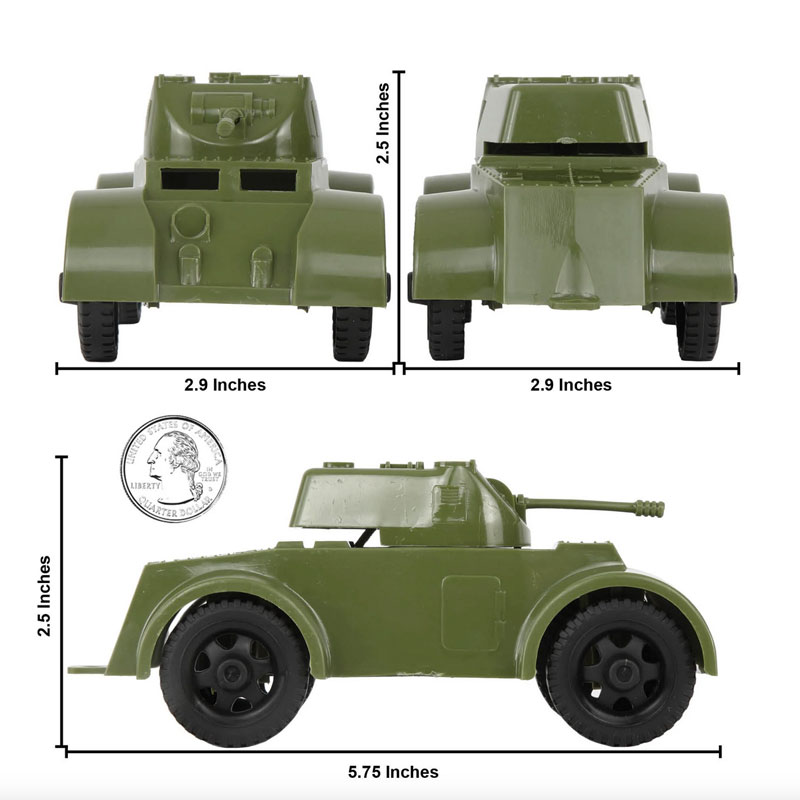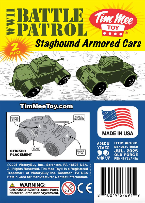 | The Tim Mee Toy Staghound is ready to roll again. These Tim Mee Toy #76 Military Armored Reconnaissance Scout Vehicles are proudly manufactured in the United States. This 2 piece Set of Armored Cars feature turrets that rotate and smooth rolling metal axles. Each car measure 5.75 inches long and approximately 1:40 scale. Made from slightly stiff OD-Green color HDPE plastic with medium detail and a little flashing. This vehicle was modeled after the WW2 T17 Staghound and was produced in the 1950s by Processed Plastic Co. (Tim Mee Toy's parent company at the time). This 2025 version is the first production run since the 1960s and features a modified hitch compatible with the current Tim Mee Toy Combat Patrol M3 Artillery for maximum play value. This is real American made toy, meant to be rolled around, knocked over, picked up and played with for years to come. Packed in clear bag with insert card and includes optional sticker sheet to customize your vehicles. Recommended for ages 5 and up. - Color: OD-Green - Size: 5.75 inches long x 2.9 inches wide x 2.5 inches tall - Scale: Approximately 1:40 |