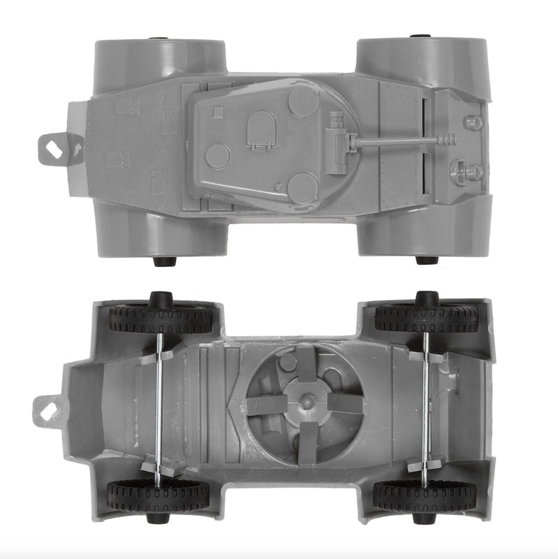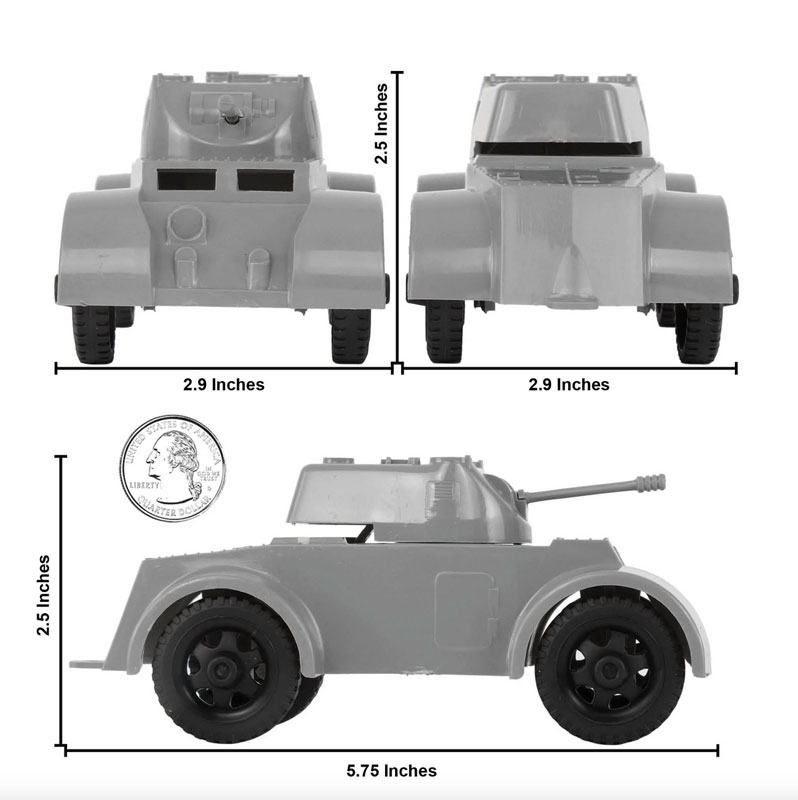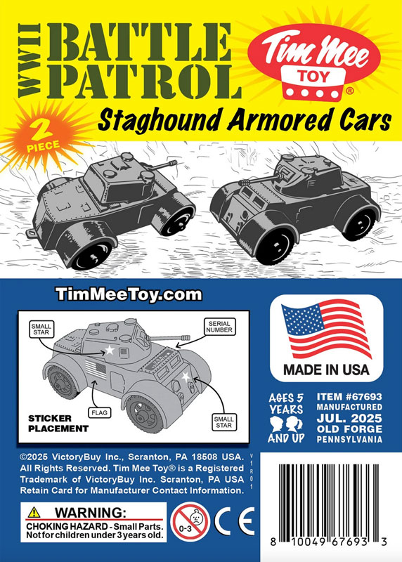 | The Tim Mee Toy Staghound is ready to roll again. These Tim Mee Toy #76 Military Armored Reconnaissance Scout Vehicles are proudly manufactured in the United States. This 2 piece Set of Armored Cars feature turrets that rotate and smooth rolling metal axles. Each car measure 5.75 inches long and approximately 1:40 scale. Made from slightly stiff OD-Green color HDPE plastic with medium detail and a little flashing. This vehicle was modeled after the WW2 T17 Staghound and was produced in the 1950s by Processed Plastic Co. (Tim Mee Toy's parent company at the time). This 2025 version is the first production run since the 1960s and features a modified hitch compatible with the current Tim Mee Toy Combat Patrol M3 Artillery for maximum play value. This is real American made toy, meant to be rolled around, knocked over, picked up and played with for years to come. Packed in clear bag with insert card and includes optional sticker sheet to customize your vehicles. Recommended for ages 5 and up. - Color: Gray - Size: 5.75 inches long x 2.9 inches wide x 2.5 inches tall - Scale: Approximately 1:40 |