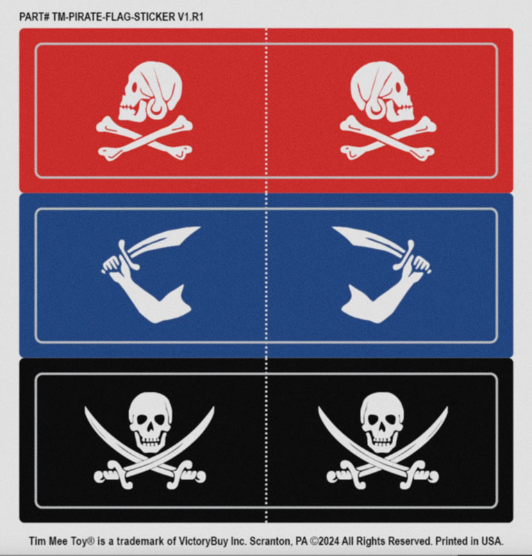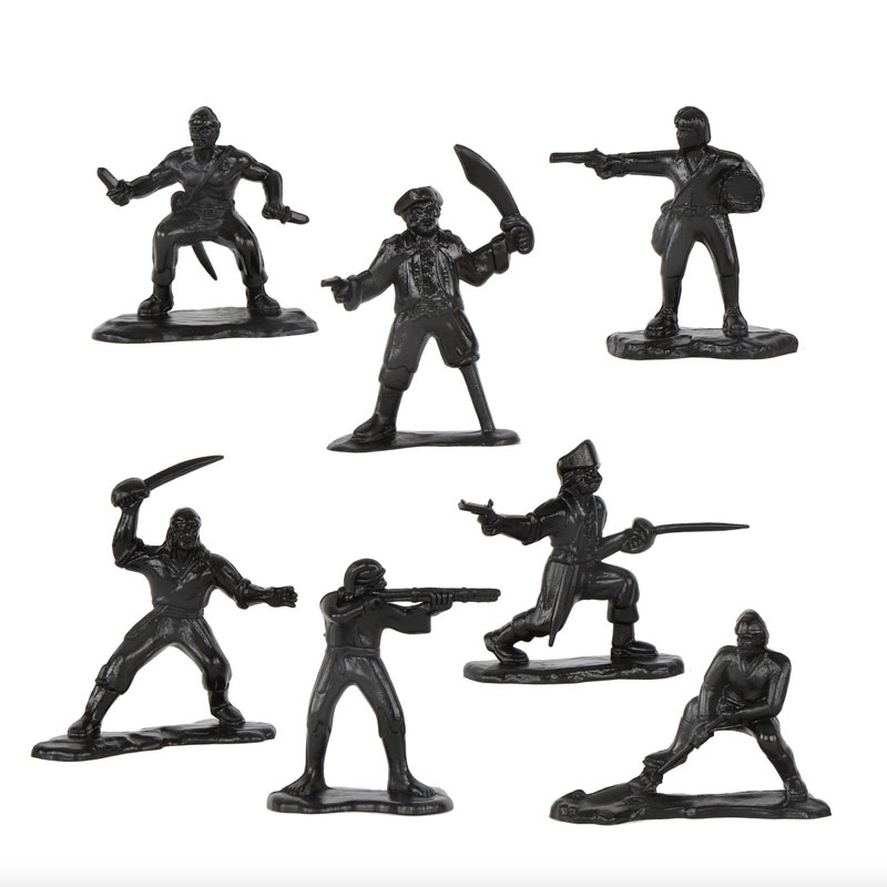 Manufacture Product Number : TME-67855 | The Tim Mee Toy Pirates of Treasure Island Playset is ready for your swashbuckling adventures on the high seas. This 87 piece Set of is proudly manufactured in the United States, and includes 72 pirate figures in 7 poses and 3 colors for maximum play value. Also includes a row boat, naval Cannon, island, treasure chest, 4 palm trees, 4 ferns, and 3 pirate flags. The buccaneers stand up to 2 inches tall with medium detail, some flashing and are approximately 1:40 scale. The figures and greenery are made from slightly flexible LDPE plastic and accessories are made from HDPE plastic. The Island measure 6.25 x 5.75 x 3 inches tall and features a removable top that reveals a perfect spot to hide the treasure chest or use as a defensive position. The treasure chest measures 2 x 1.25 x 1.25 inches tall with a removable lid. The rocky dock is 6 inches in diameter and stands 2 inches tall. Wooden type rowboat is 6.75 inches long includes 2 oars and bench seats. The tallest palm tree measures 5 inches tall and cannon is 4.4 inches long. The pirates, island, boat, treasure chest and dock were originally produced in the 1990's by Processed Plastic Co. (Tim Mee Toy's parent company at the time) and were offered in a variety of bagged, boxed, and bucket Sets. The cannon was first offered around the 1960s by MPC (Multiple Products Corporation). The palm trees and jungle ferns were first produced in the 1950s by Louis Marx and Co. and included in a number of their legendary boxed Playsets. These are real American Made plastic toys, meant to be set up, knocked down, picked up and played with for years to come. Packed in sturdy reusable storage bucket and recommended for ages 5 and up. - 24 Powder-Blue, 24 Red, and 24 Black Color Pirate Figures & 3 Flags - Island, Row Boat, Treasure Chest, Cannon, 4 Palms & 4 Ferns - Scale: Figures approximately 1:40, accessories 1:40 to 1:32 scale |