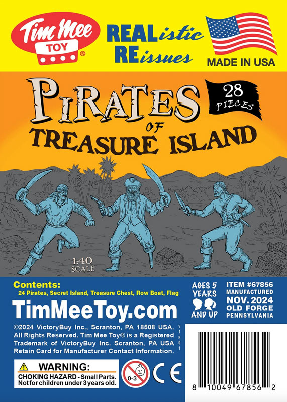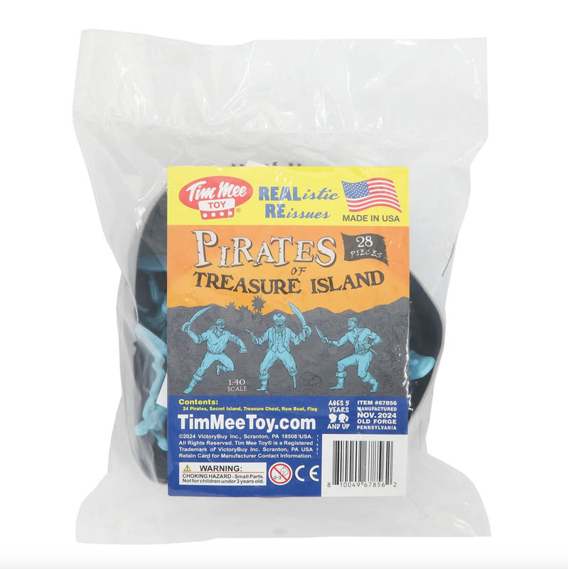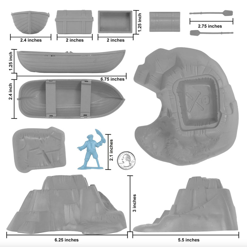 | The Tim Mee Toy Pirates of Treasure Island are ready for your swashbuckling adventures on the high seas. This 28 piece Set of is proudly manufactured in the United States, and includes 24 pirate figures in 7 poses for maximum play value. Also includes a pirate flag, row boat, Secret Island, and a Treasure Chest. The buccaneers stand up to 2 inches tall with medium detail, very little flashing and are approximately 1:40 scale. The figures are made from slightly flexible Powder-Blue color LDPE plastic and accessories are made from Gray color HDPE plastic. The Island measure 6.25 x 5.75 x 3 inches tall and features a removable top that reveals a perfect spot to hide the treasure chest or use as a defensive position. The treasure chest measures 2 x 1.25 x 1.25 inches tall with a removable lid. The wooden rowboat is 6.75 inches long includes 2 oars and bench seats. Originally produced in the 1990's by Processed Plastic Co. (Tim Mee Toy's parent company at the time) and were offered in a variety of bagged, boxed, and bucket Sets. These figures and accessories are a fun addition to any pirate themed Playset or school project diorama. These are real American Made plastic toys, meant to be set up, knocked down, picked up and played with for years to come. Packed in clear bag with insert card and recommended for ages 5 and up. - Colors: Powder-Blue and Gray - Size: 4.5 inches long x 1.6 inches wide x 1.6 inches tall - Scale: Figures approximately 1:40, accessories 1:40 to 1:32 scale |