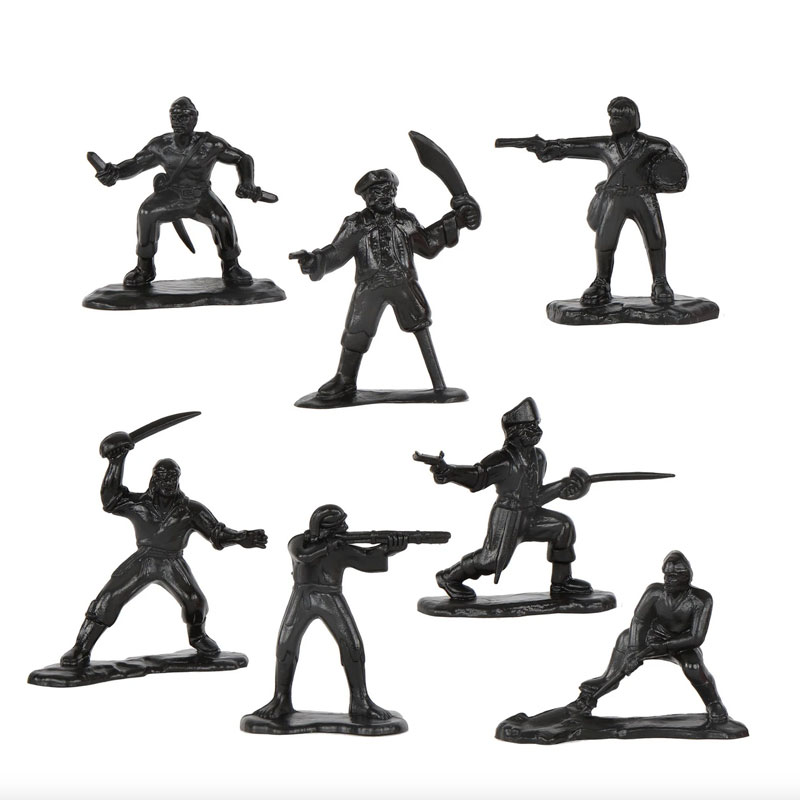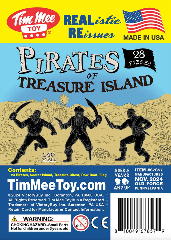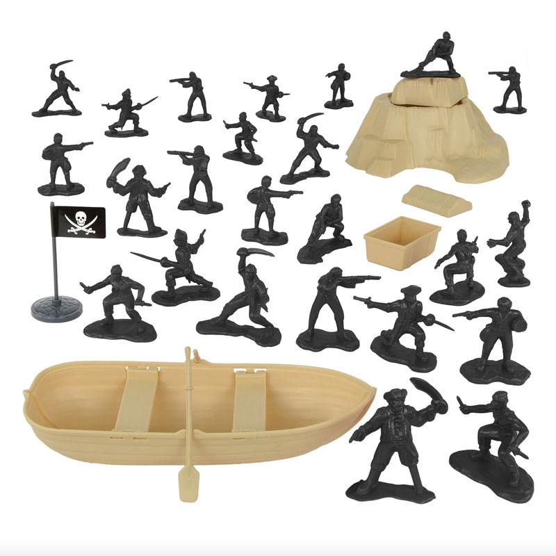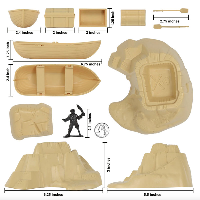 | The Tim Mee Toy Pirates of Treasure Island are ready for your swashbuckling adventures on the high seas. This 28 piece Set of is proudly manufactured in the United States, and includes 24 pirate figures in 7 poses for maximum play value. Also includes a pirate flag, row boat, Secret Island, and a Treasure Chest. The buccaneers stand up to 2 inches tall with medium detail, very little flashing and are approximately 1:40 scale. The figures are made from slightly flexible Powder-Blue color LDPE plastic and accessories are made from Gray color HDPE plastic. The Island measure 6.25 x 5.75 x 3 inches tall and features a removable top that reveals a perfect spot to hide the treasure chest or use as a defensive position. The treasure chest measures 2 x 1.25 x 1.25 inches tall with a removable lid. The wooden rowboat is 6.75 inches long includes 2 oars and bench seats. Originally produced in the 1990's by Processed Plastic Co. (Tim Mee Toy's parent company at the time) and were offered in a variety of bagged, boxed, and bucket Sets. These figures and accessories are a fun addition to any pirate themed Playset or school project diorama. These are real American Made plastic toys, meant to be set up, knocked down, picked up and played with for years to come. Packed in clear bag with insert card and recommended for ages 5 and up. - Colors: Black and Tan - Size: 4.5 inches long x 1.6 inches wide x 1.6 inches tall - Scale: Figures approximately 1:40, accessories 1:40 to 1:32 scale |