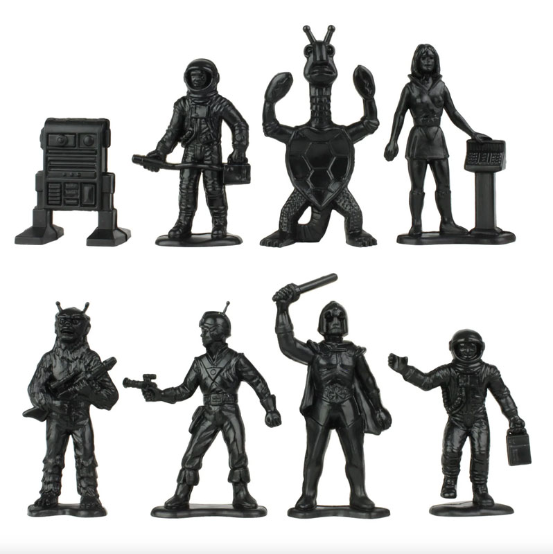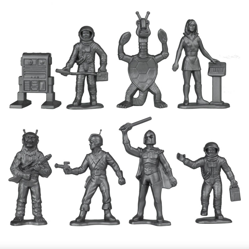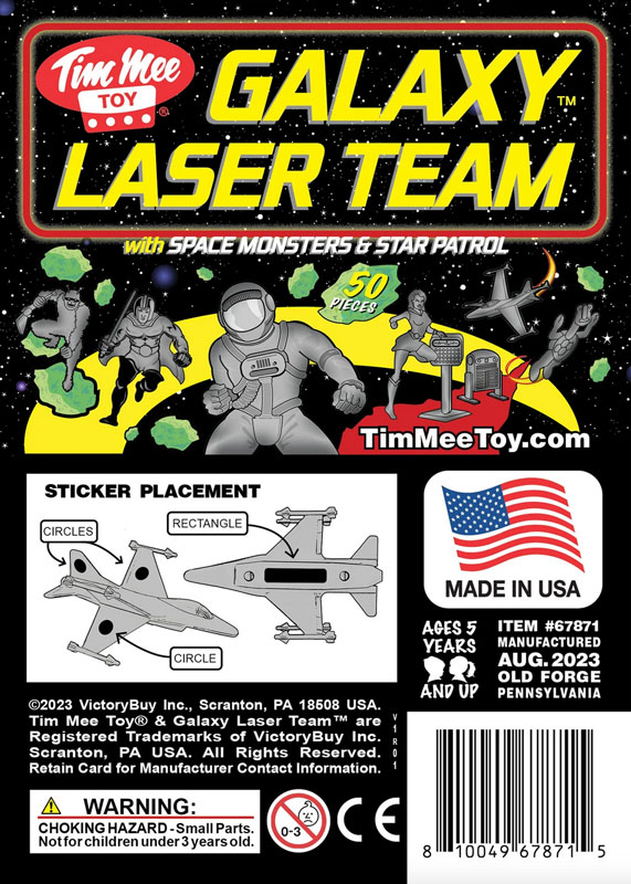 Manufacture Product Number : TME-67871 | From a Galaxy far-out and away, an underground Sci-Fi classic from the 70's is back. This Set of 50 Tim Mee Toy Galaxy Laser Teamn with Space Monsters figure Set is proudly manufactured in the United States, and includes 24 Black and 24 Silver-Gray figures along with 2 small space fighters for maximum play value. All your old favorites are here, including turtle-lobster alien, space-sasquatch alien, classic serial space hero, mailbox-shaped droid, sword-wielding villain, 2 Mercury era astronauts, and even the heroine with her trusty computer console. Figures stand up to 2.25 inches tall and are approximately 1:35 scale. X-wing rockets are 3.75 inches long and smaller scale. Made from slightly flexible LDPE plastic with medium detail and very little flashing. Originally produced by Processed Plastic Co. (Tim Mee Toy's parent company at the time) around 1978, they were also branded as Star Patrol with X-Wing Rocket and Outer Space Fighters. These figures celebrate a funky mash-up of space movie characters from the old black and white serials to that famous space opera in a galaxy far-far away. Package includes an optional sticker sheet to customize your star fighters. These are real plastic heroes and villains, meant to be set up, knocked down, picked up and played with for many years to come. Packed in clear bag with insert card and recommended for ages 5 and up. - Colors: Black and Silver-Gray - Size: Figures stand up to 2.25 inches tall, Ships 3.75 inches long - Scale: Figures approximately 1:35, Ships approximately 1:200 |