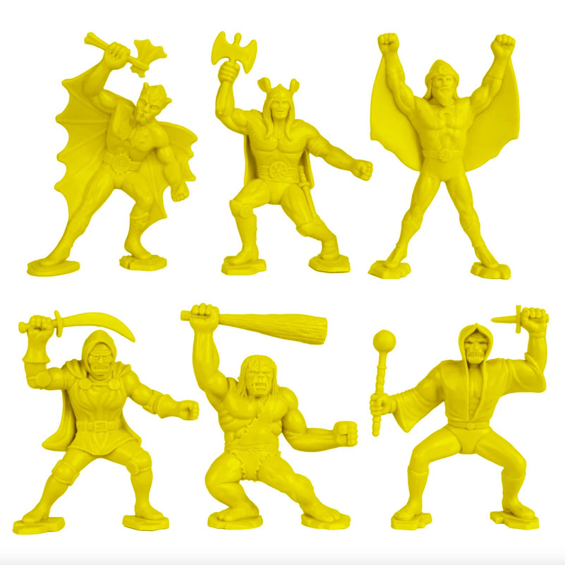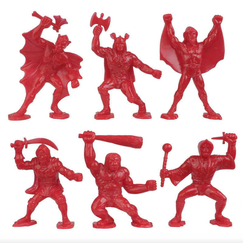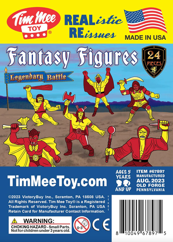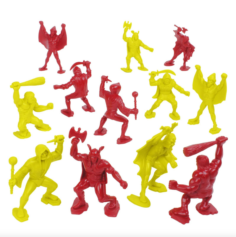 Manufacture Product Number : TME-67897 | From the depths of imagination long-lost warriors return... This bag of 24 Tim Mee Toy Legendary Battle Fantasy Figures is proudly manufactured in the United States and includes 12 Rust-Brown and 12 Gray figures for maximum play value. There's 6 different figures including Saber Tooth Caveman, Viking Hero, Super Sorcerer, Bat-Wolfman, Skull-Sorcerer, and Secret Samurai Warrior. Figures stand up to 3.1 inches tall and are about 1:24 scale. Made from slightly flexible LDPE plastic with excellent detail and very little flashing. Originally produced in 1986 by Processed Plastic Co. (Tim Mee Toy's parent company at the time), these figures are a wild mash-up of bizarre characters that could inhabit any Sword and Sorcery or Sci-Fi universe. These are real American Made plastic warriors, meant to be set up, knocked down, picked up and played with for years to come. Packed in clear bag with header card and recommended for ages 5 and up. - Colors: 12 Red and 12 Yellow - Size: Figures stand up to 3.1 inches tall - Scale: Approximately 1:24 |
