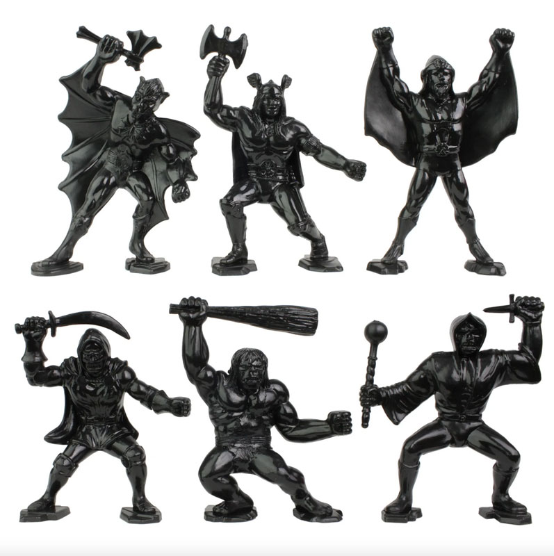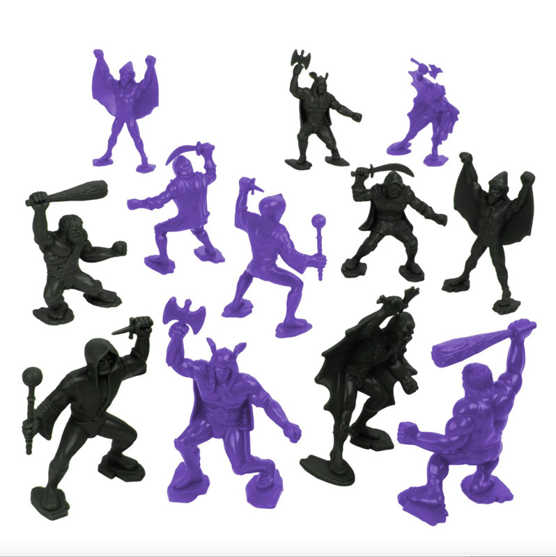 Manufacture Product Number : TME-67898 | From the depths of imagination long-lost warriors return... This bag of 24 Tim Mee Toy Legendary Battle Fantasy Figures is proudly manufactured in the United States and includes 12 Rust-Brown and 12 Gray figures for maximum play value. There's 6 different figures including Saber Tooth Caveman, Viking Hero, Super Sorcerer, Bat-Wolfman, Skull-Sorcerer, and Secret Samurai Warrior. Figures stand up to 3.1 inches tall and are about 1:24 scale. Made from slightly flexible LDPE plastic with excellent detail and very little flashing. Originally produced in 1986 by Processed Plastic Co. (Tim Mee Toy's parent company at the time), these figures are a wild mash-up of bizarre characters that could inhabit any Sword and Sorcery or Sci-Fi universe. These are real American Made plastic warriors, meant to be set up, knocked down, picked up and played with for years to come. Packed in clear bag with header card and recommended for ages 5 and up. - Colors: 12 Purple and 12 Black - Size: Figures stand up to 3.1 inches tall - Scale: Approximately 1:24 |