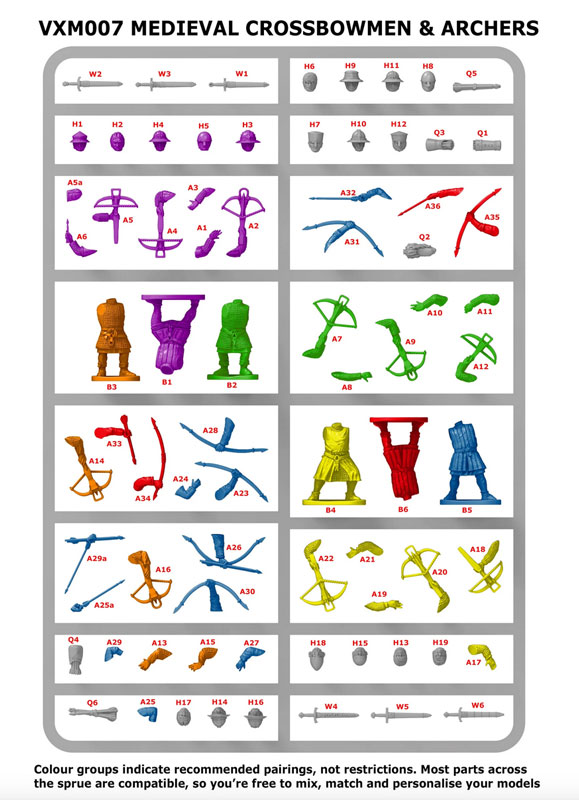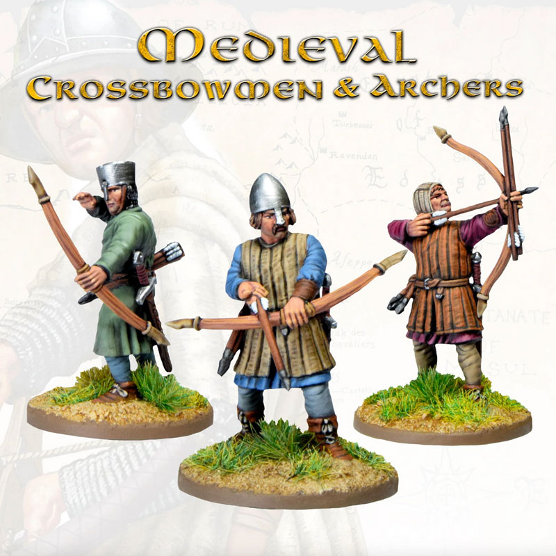 Manufacture Product Number : VIC-VXM007 | This is a 30 figure set, giving you 20 Crossbowmen and 10 archers. You get numerous arm and head options as you have come to expect from us! That every figure can be made differently. These figures can be used in the Crusades and Europe from the late 12th to late 13th centuries. Europe was a hotbed of conflict and you can use them on the fields of France, Spain, Germany and England during the Barons wars and conflicts with the Scots, Welsh and Irish. For those who are familiar with our Norman Crossbowmen you will see the later development in the crossbow on these figures. A stirrup has been added to the end of the weapon to help in drawing back the string. You would put your foot into the stirrup, attach the draw string to the hook on the belt and straighten your leg and lean upwards pulling the draw string to cock the bow. This made loading a lot quicker and led to the development of a more powerful crossbow. We have also included some archers in Gambeson. You can mix these with and use alongside a lot of the figures in our Dark Age archers set to give you a fantastic amount of variation in your archer units. The English infantrymen adopted the bow as their principal weapon from Henry III assize of arms in 1242 and so fielded large forces of archers whereas the Crossbow was more widely adopted by the French. The Italians, Gascons and Catalans were also famed for the expertise with the Crossbow. General Medieval tactics tended to be the infantry including spearmen, archers and Crossbowmen forming a solid block in the centre. The cavalry would attack and then pullback to reform behind the solid infantry wall before charging out to attack again. All models are supplied as kits and will need to be assembled and painted. The picture illustrates how the model should look once completed. Glue and paint are not included in the kit. |