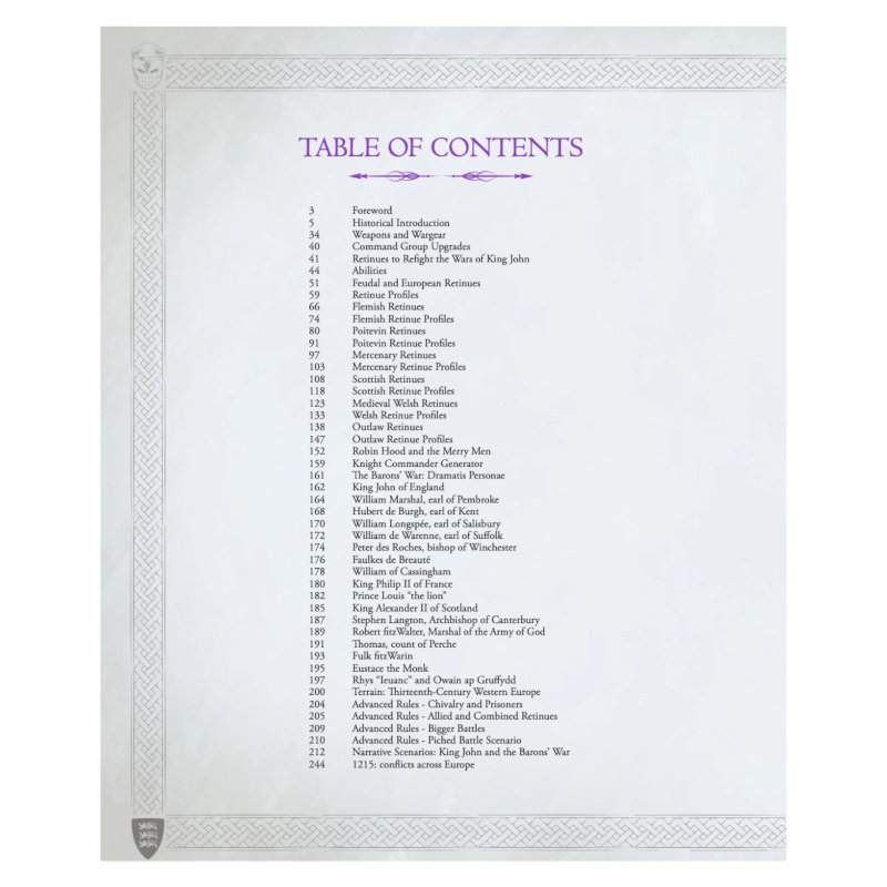 A MIGHTY TOME TO EXPAND YOUR BARONS' WAR EXPERIENCE! The reign of King John (1199-1217) was a tumultuous turning-point in the history of England. Decades of tension with the kings of France boiled over into conflict which saw Normandy, Brittany and Anjou lost. Meanwhile the fractious and restive rulers of Wales sought to exploit any sign of weakness and the kings of Scotland cast covetous eyes on Northumbria. At centre stage was King John, a figure whose distrusting nature made him as ungrateful to his allies as he was spiteful to his enemies. Resentment, hatred and fear pushed many of England's barons into armed defiance, leading to the Magna Carta, an unprecedented compromise limiting royal power. When it was quashed by the Pope, civil war followed. The Barons' War: King John brings these turbulent times onto the tabletop. It updates the Feudal European retinue list and introduces six more factions to the game: the light and flexible Welsh, the diverse and colourful Scottish, the aggressive Poitevins and the proudly disciplined Flemish, as well as hard-bitten professional Mercenaries and the cunning and desperate Outlaws. The sourcebook also provides rules and background for a score of the dramatis personae of the story, enabling you to command your troops with the vindictive King John, the chivalrous William Marshal and the scheming King Philip Augustus - or even Robin Hood and his Merry Men. Ten historical scenarios allow you to re-tell the bloody story of King John's reign, from bitter clashes in the Welsh Marches to the king's harrying of his enemies. You can recreate the titanic pitched battle of Bouvines or follow the stages of the climatic battle of Lincoln. Whichever side you take, there will be something for you in the first supplement for the new edition of The Barons' War. |