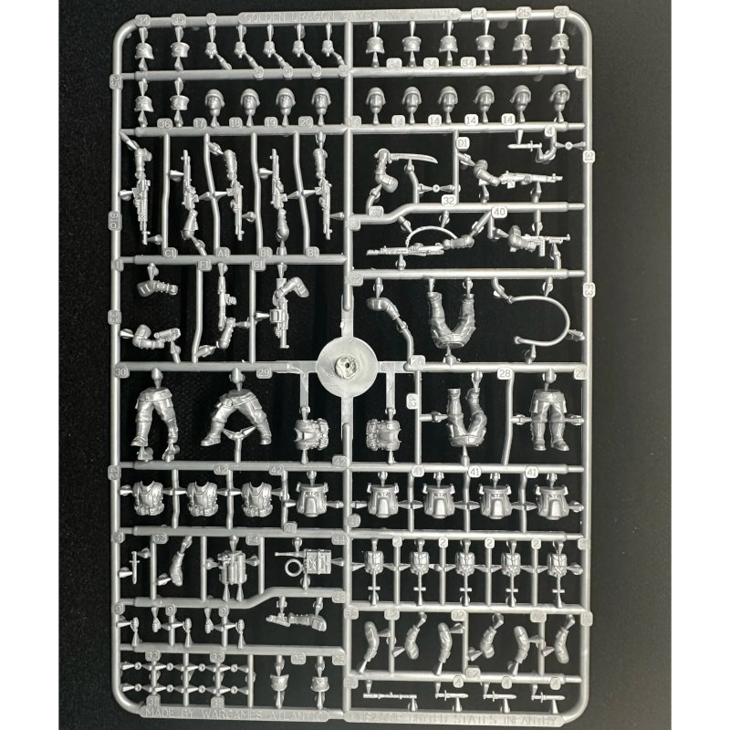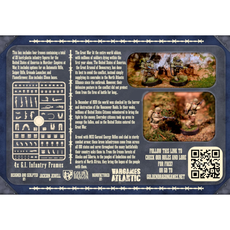 Manufacture Product Number : WAA-MUSA001P This box includes four frames containing a total of 20 hard-plastic infantry figures for the United States of America in Marcher: Empires at War. It includes options for an Automatic Rifle, Sniper Rifle, Grenade Launcher, and Flamethrower. Also includes 25mm bases. |