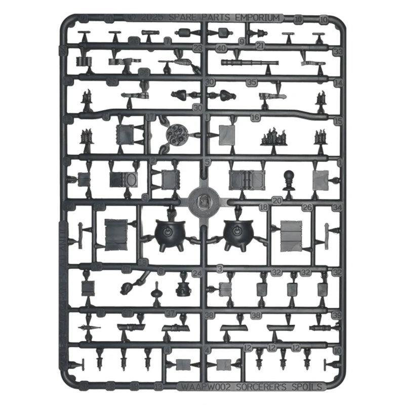 Manufacture Product Number : WAA-PW002 BITS GALORE! Over 300 plastic bits in this box to add to your models, bases, dioramas, and more! Everything from cauldrons, sacks, candles, tomes, potions...and more and more! |