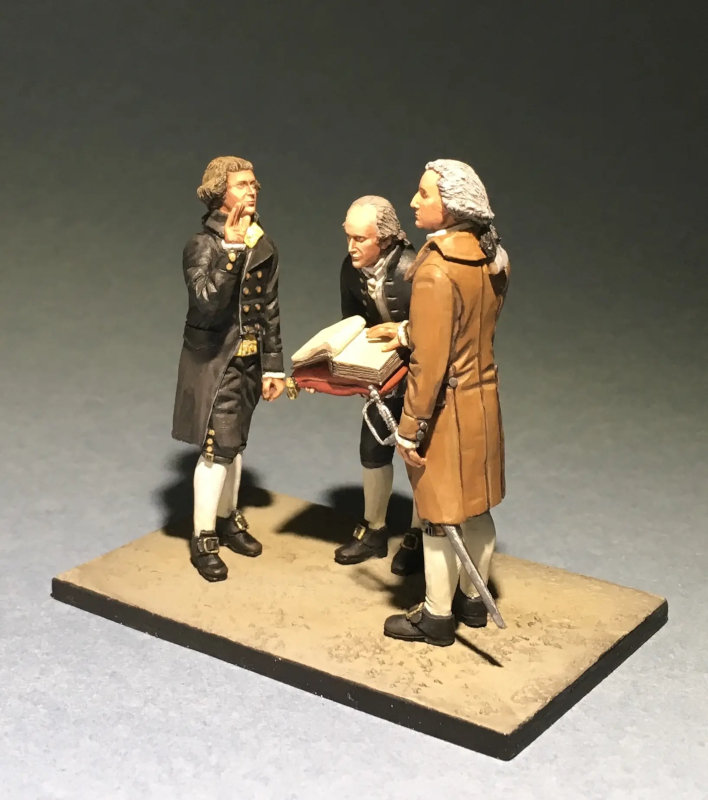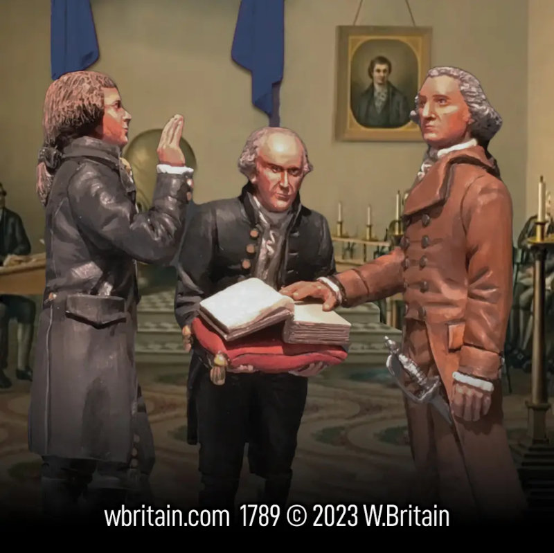 Manufacture Product Number : WBN-1789 | George Washington’s Inauguration Washington was inaugurated as the first President of the United States at Federal Hall in New York, then the nation’s capitol. Famously, Washington was reluctant to accept the presidency and had written that he had given up, “all expectations of private happiness in this world.” But he also knew that this burden of duty was one he could not decline. Washington was keenly aware that everything he did at the swearing-in would set precedent. Even though he had gained his reputation through military service, he chose not to be in uniform. Instead, he wore an American-made brown suit, fashioned from broadcloth, wishing to set a trend. “I hope…it will be unfashionable for a gentleman to appear in any other dress,” he told his friend, the Marquis de Lafayette. As a nod to his martial past, he wore a less ostentatious dress sword on his hip, sheathed in a simple steel scabbard. Recreated here is that humble and noble scene. The three 1/30 scale figures stand approximately 2½” tall, are cast in white metal and hand painted in stunning detail – all mounted on a sturdy alloy base. These historically accurate miniatures are sure to inspire and enchant enthusiasts and casual collectors alike. |