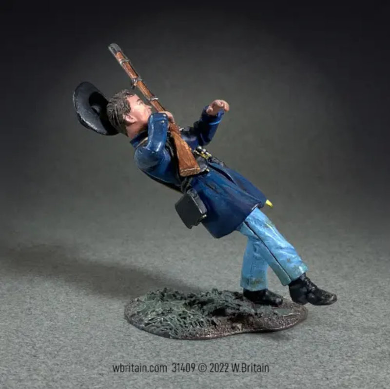 Manufacture Product Number : WBN-31409 The Iron Brigade consisted of the 2nd, 6th, 7th Wisconsin, 24th Michigan, and 19th Indiana regiments – an all western brigade with a reputation of strong discipline and a tough-fighting tenacity exhibited throughout the entire American Civil War. Scornfully referred to by Confederate soldiers as “Those Damn Black Hats” the Iron Brigade fought in most of the eastern campaigns from 1862 onwards at famous battles such as Second Bull Run, Antietam, Fredericksburg, and Gettysburg, suffering horrific casualties along the way. The Iron Brigade suffered the highest percentage of casualties of any brigade in the war. Seen here is one such Iron Brigade Casualty falling in one of the major engagements they fought during the American Civil War. |