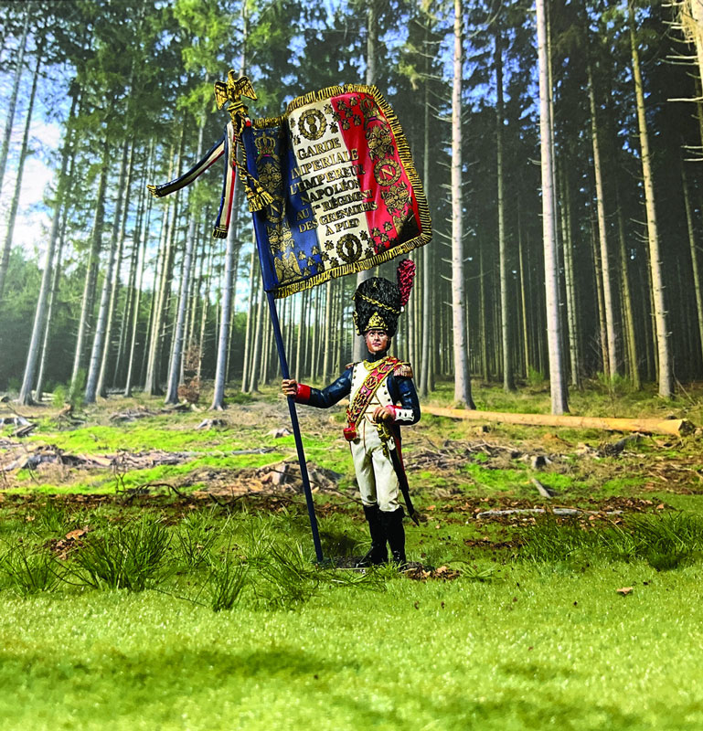 Manufacture Product Number : WBN-36224 | This Grenadier has the honor of being the Porte-Aigle, or Eagle Bearer, of the 1st Regiment of Imperial Guard Grenadiers. A small party made up of officers and men was chosen to protect the eagle at any cost. The oiled silk tricolored flag was richly embroidered in gold with the regimental title and insignia on the front and a list of battle honors on the reverse. The flag was mounted to a blue painted oak staff topped by the bronze Imperial Eagle first distributed in December of 1804. The design of the eagle was inspired by the standards of the Roman Legions with the left facing eagle perched on Jupiter’s spindle resting on a plinth with the regiment’s number applied to the front. The flag, eagle, and staff weighed approximately 10 pounds, with the eagle alone weighing about 4 pounds. Most of the eagles were destroyed by order of the newly restored Royal Government in 1814. Upon Napoleon’s return from Elba, new eagles were rapidly manufactured and issued for the Belgian campaign. |